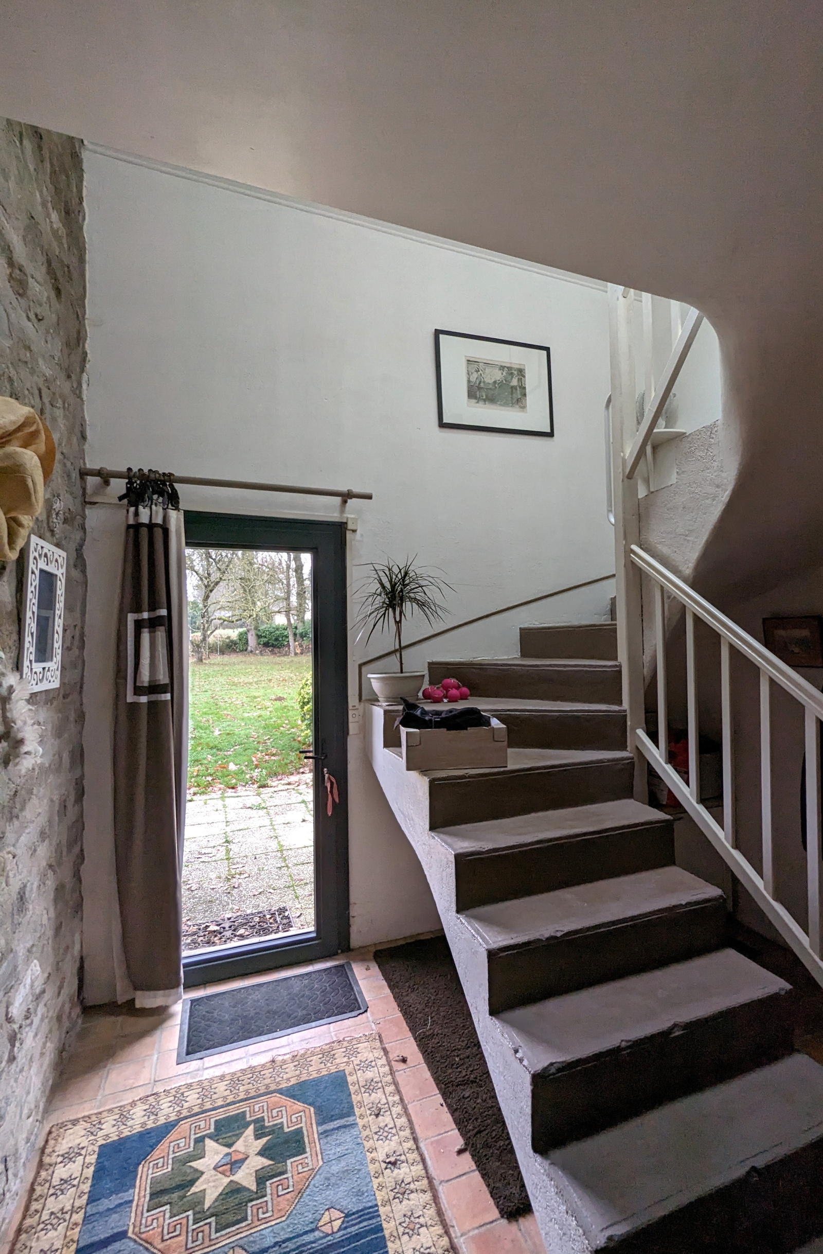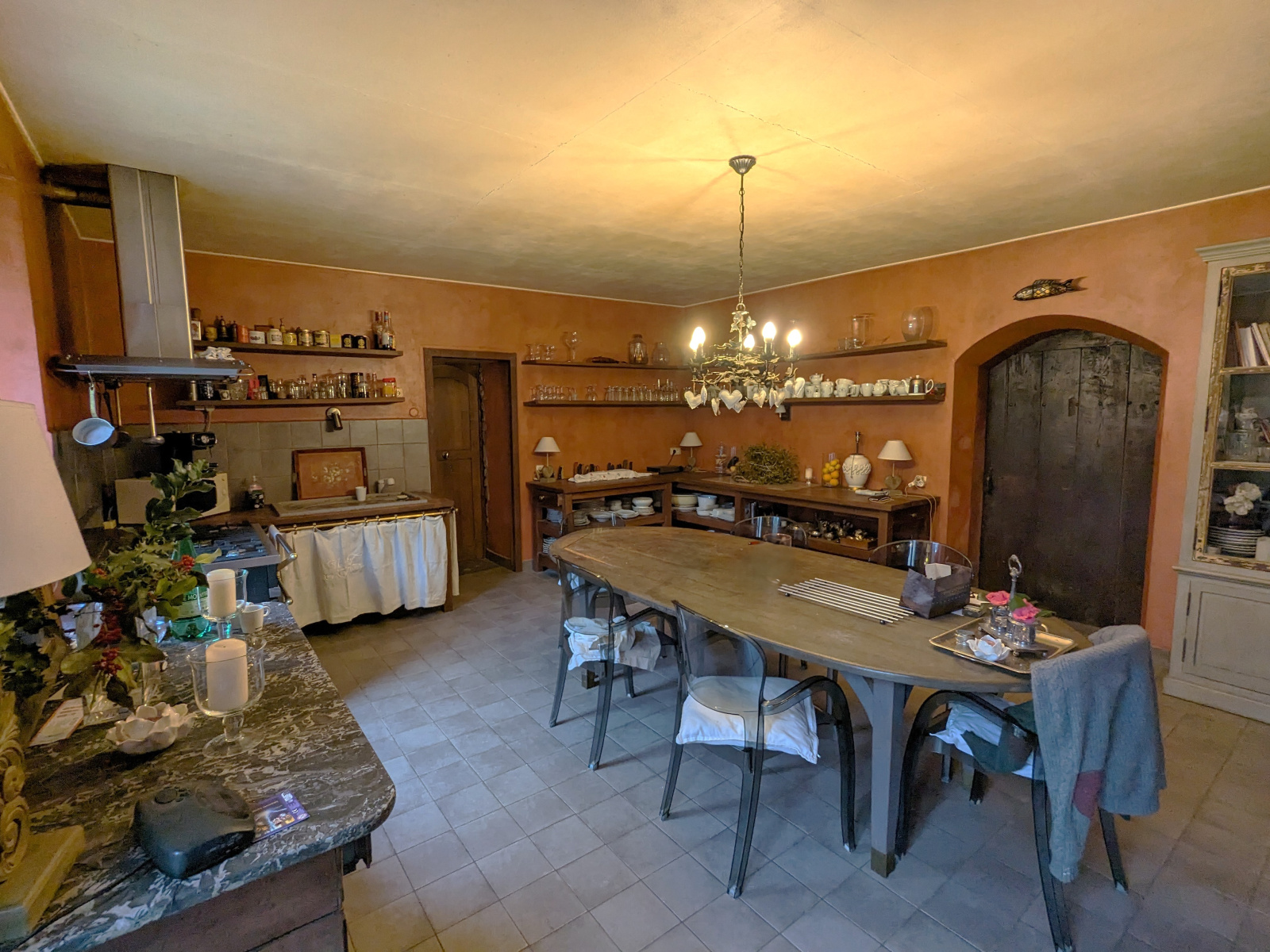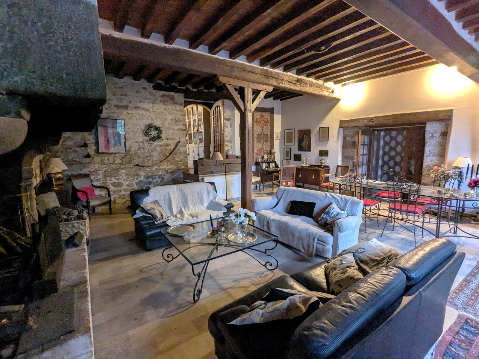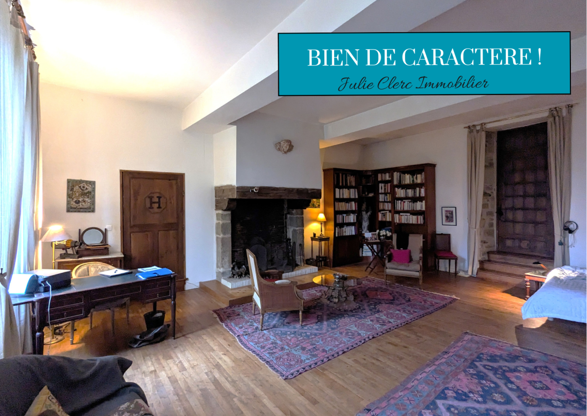Le charme s'opère dès l'entrée qui donne accès à une grande cuisine dinatoire de caractère, et à un salon d'env 50m2 avec une impressionnante hauteur sous plafond, son imposante cheminée en pierre et son accès terrasse.