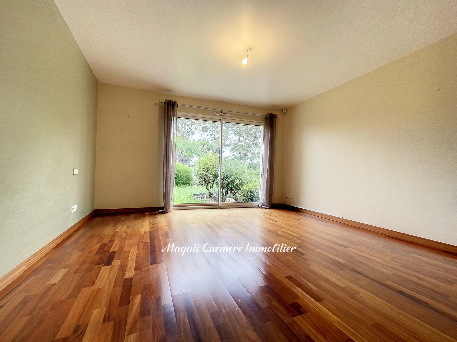 Deux baies vitrées cathédrale assurent une excellente luminosité à cette maison et permettent de profiter pleinement du jardin de 983 m², clos, arboré et de la vue sur la campagne.
