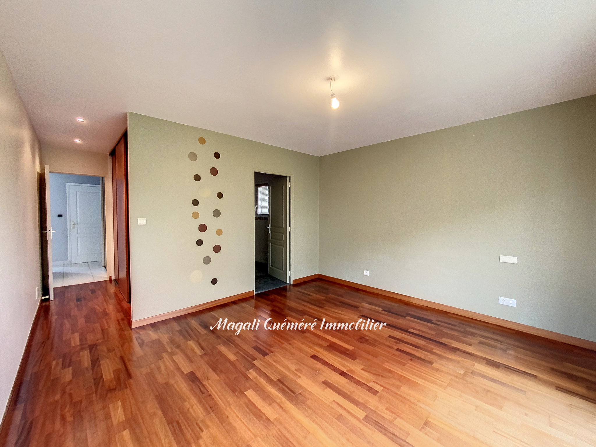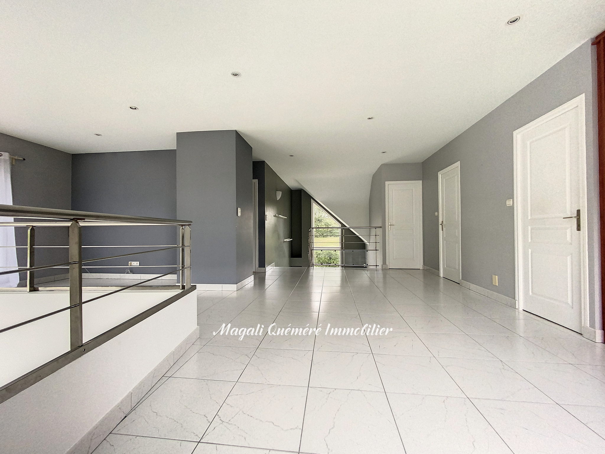 A l'étage une vaste mezzanine de 35 m² avec vide sur salon distribue 3 chambres de plus de 14 à 16 m² avec rangements: une avec salle d'eau privative, une avec balcon et salle d'eau commune à la 3ème chambre de l'étage. Placards et WC.