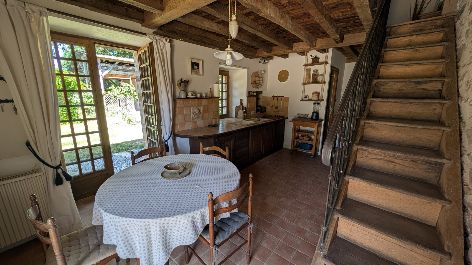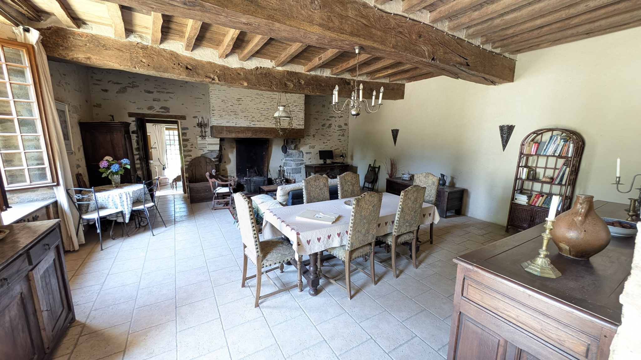 Le rez-de-jardin accueille une belle pièce de vie dotée d’une imposante cheminée en pierre, une cuisine aménagée, une salle d’eau ainsi qu’un cellier.