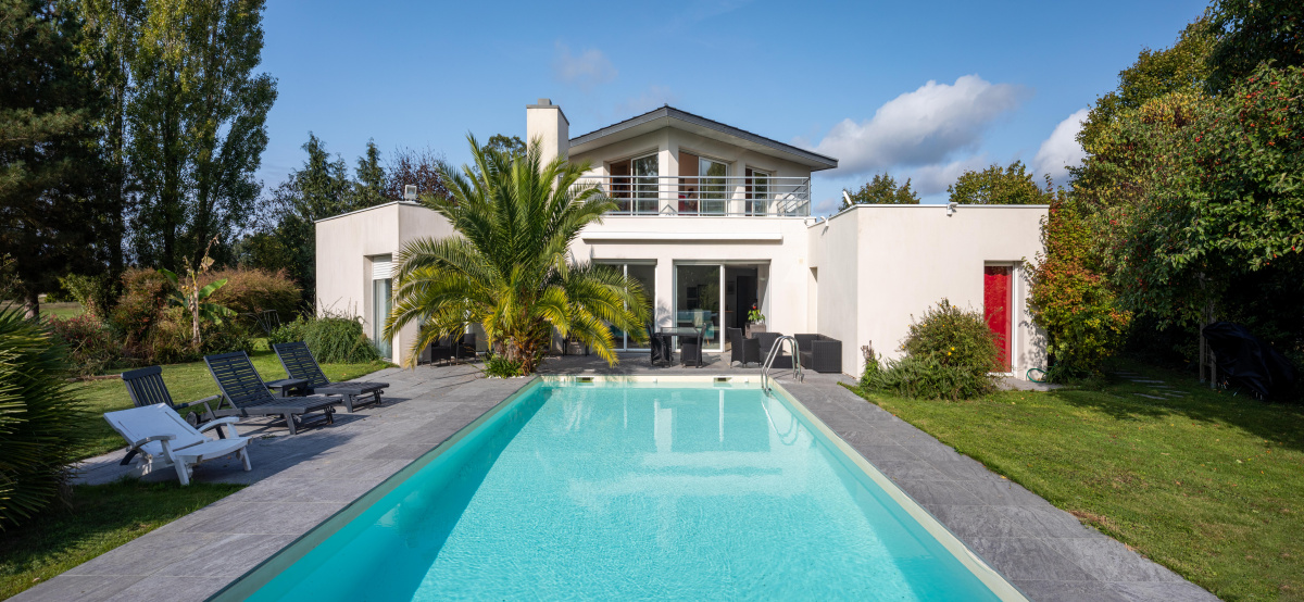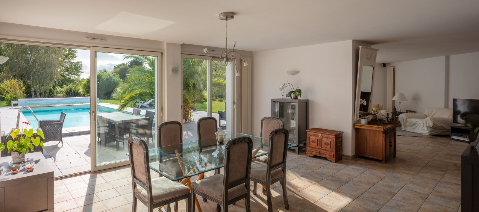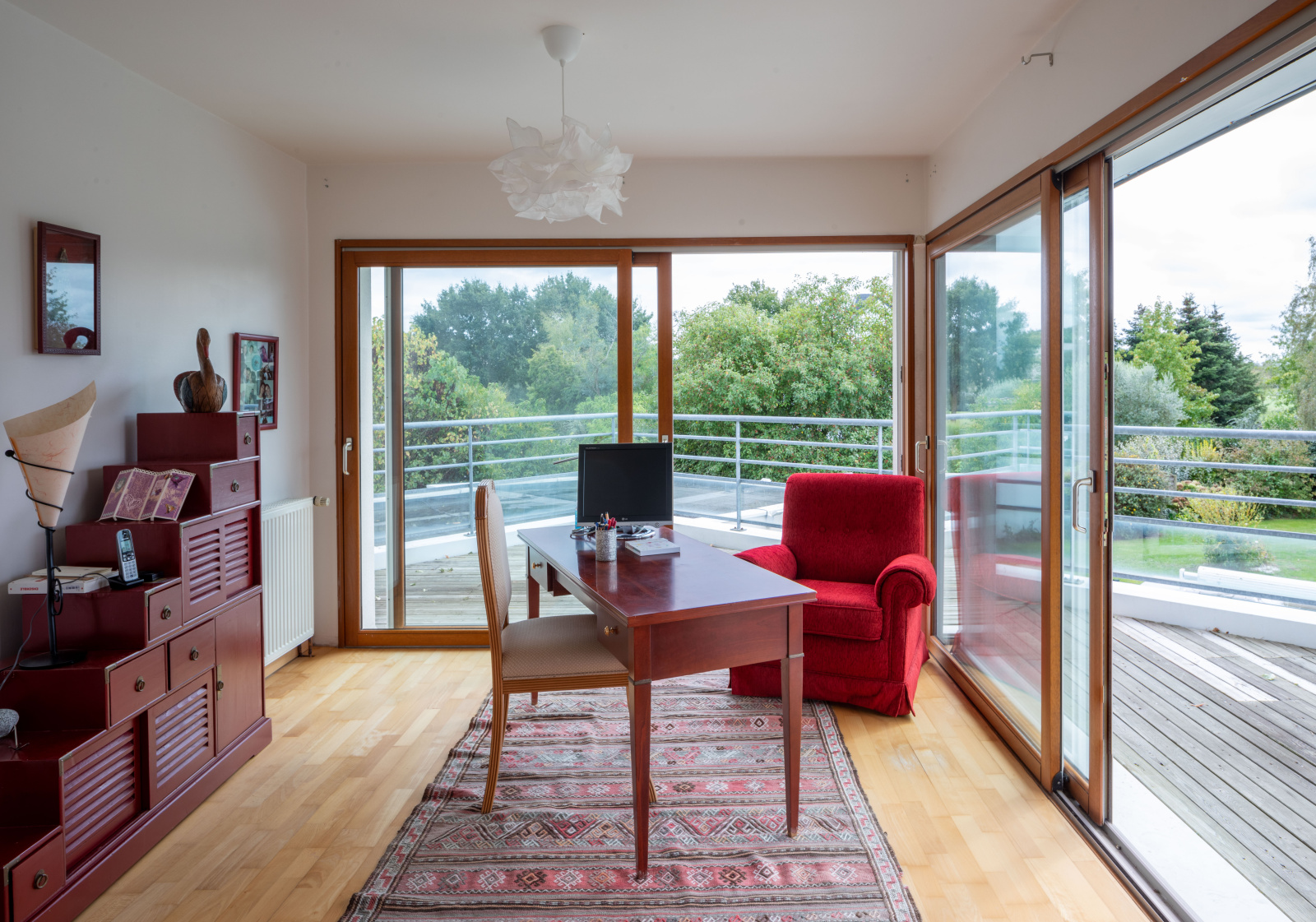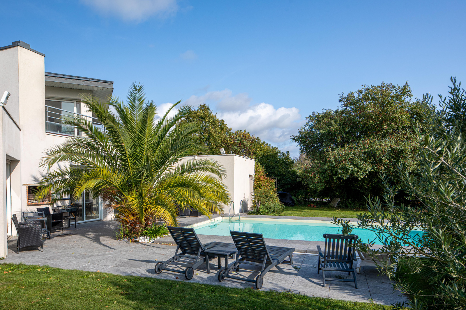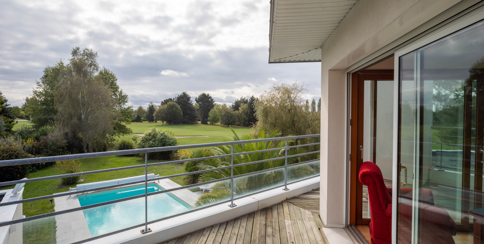 GOLF de CICE BLOSSAC - Magnifique Maison d'architecte avec vue imprenable sur le GOLF, exposée SUD et OUEST. Elle se situe à seulement 15 mn de RENNES, proche des écoles, commerces et transports en commun - Cette propriété aux volumes généreux vous offre au Rez-de-chaussée : une entrée, une cuisine entièrement aménagée et équipée ouverte sur une pièce de vie de plus de 80 m2 lumineuse de par son exposition Sud et ses grandes ouvertures, une chambre avec dressing et salle d'eau privative, trois belles chambres, 1 salle de bains, arrière cuisine et buanderie, garage double. A l'étage : une vraie suite parentale avec dressing et salle de bains attenante (douche et baignoire) et un bureau. Une terrasse donnant sur un joli jardin paysager de 1500 m2 clos et sans vis-à -vis avec piscine chauffée 5x10 m.Honoraires inclus charge acquéreur: 2.90 % TTC (Prix 1 200 000 € hors honoraires). Contactez Mme OGER Nathalie : 06.82.34.15.73 . RSAC : 803 231 471