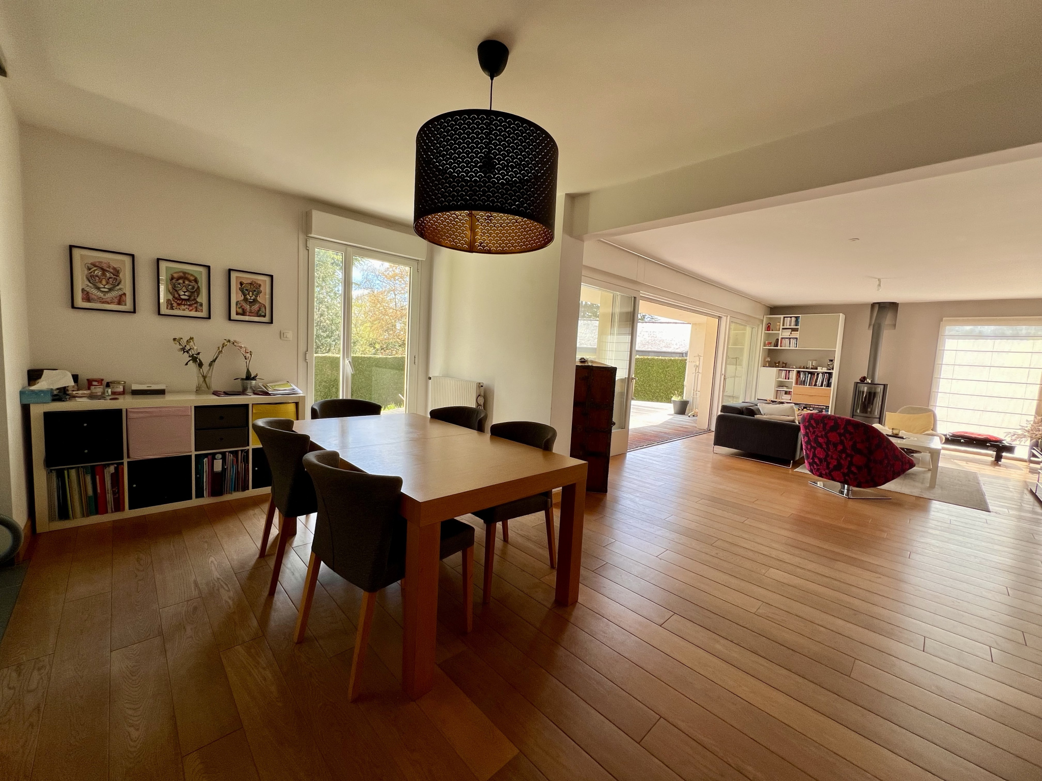 Entrée, dégagement, buanderie avec placard, cuisine aménagée et équipée, salon-séjour avec poêle à bois, couloir avec placards, Wc séparé, salle d'eau, quatre chambres, salle de bains, dégagement avec placard, Wc séparé et bureau.