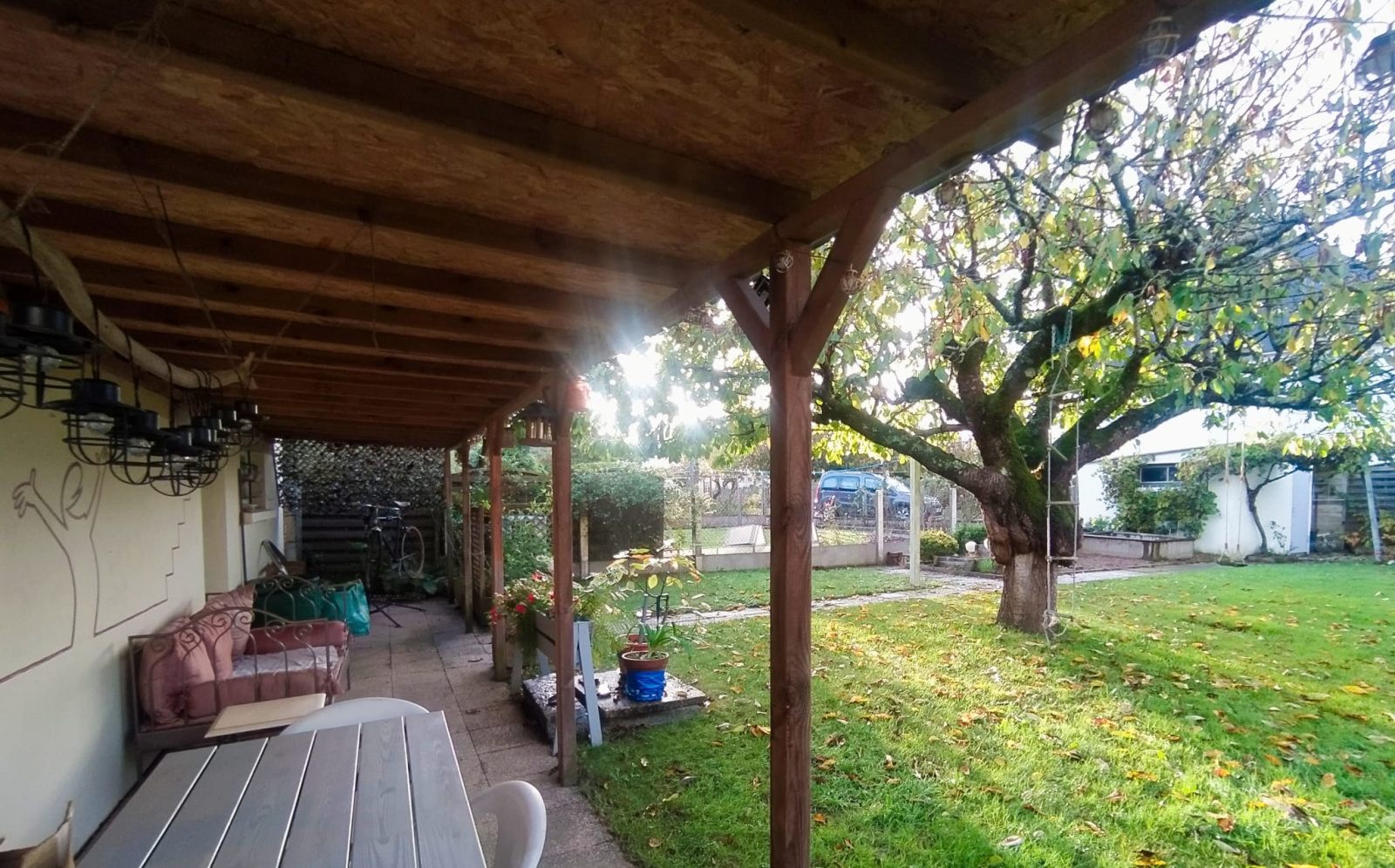 Jardin clos et arboré avec terrasse couverte et abri de jardin équipé avec électricité.