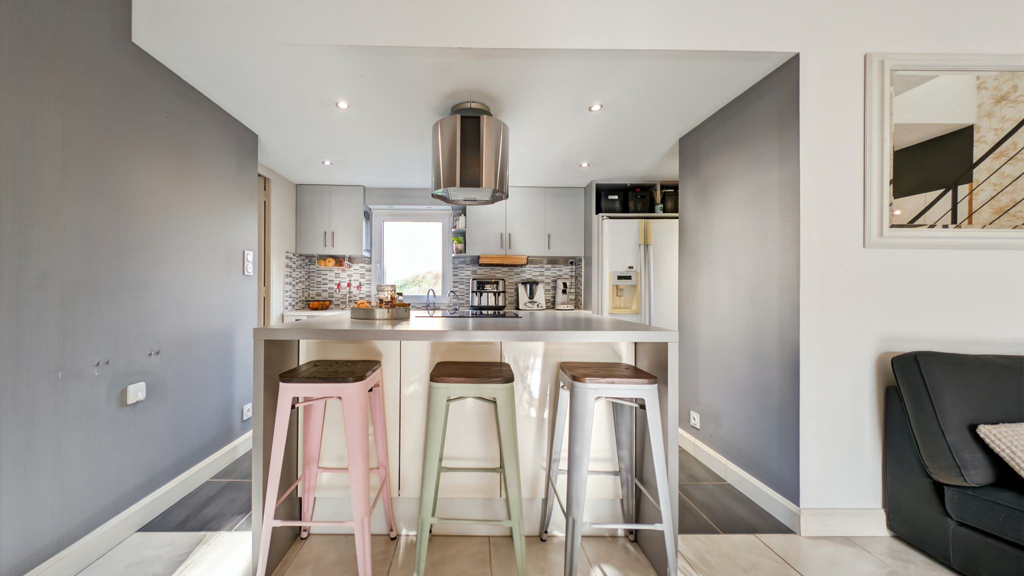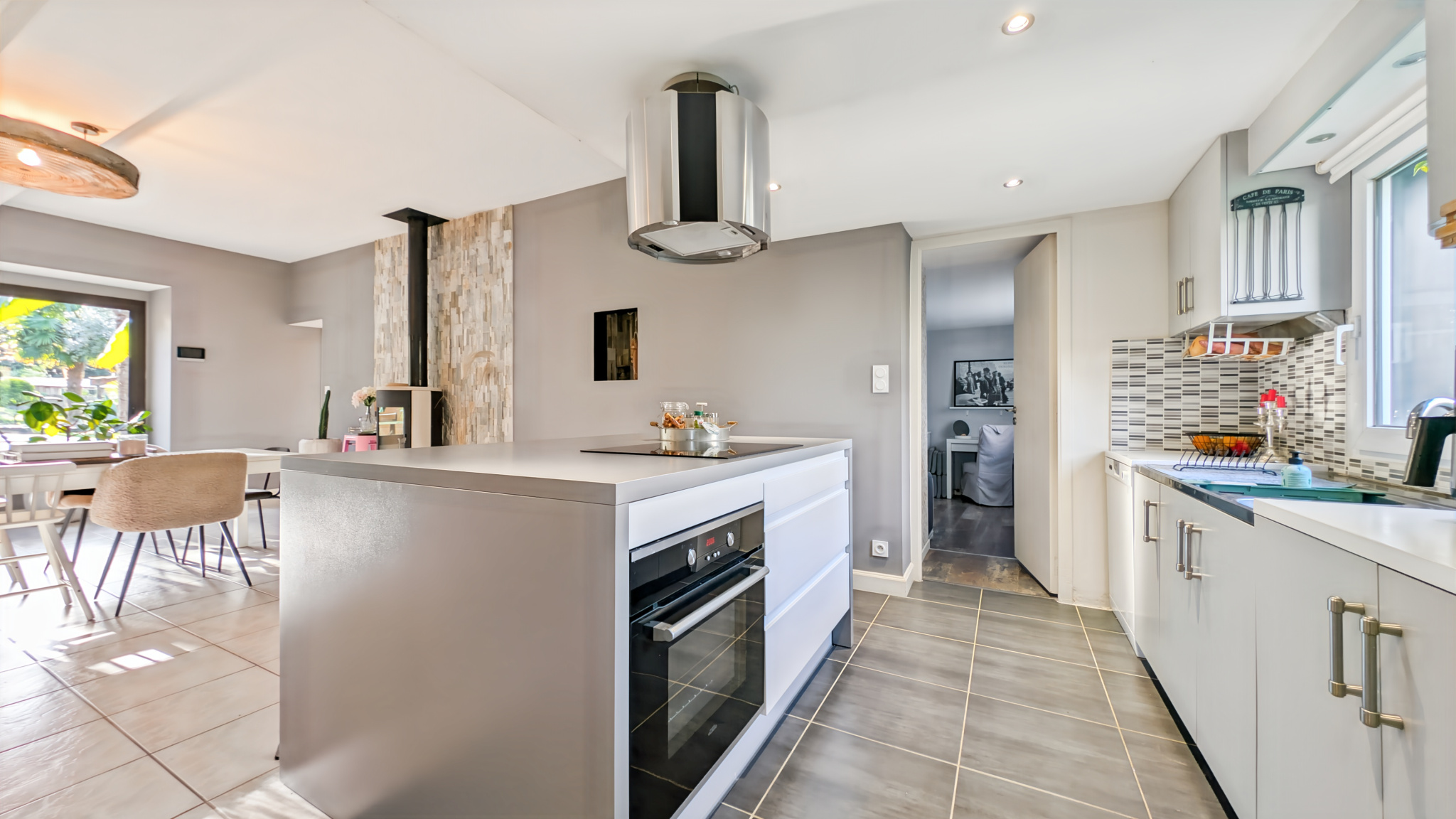 La maison s’ouvre alors sur un vaste séjour chaleureux : l’espace est pensé pour partager, recevoir, et profiter. La cuisine ouverte s’intègre naturellement, créant un véritable lieu de vie.