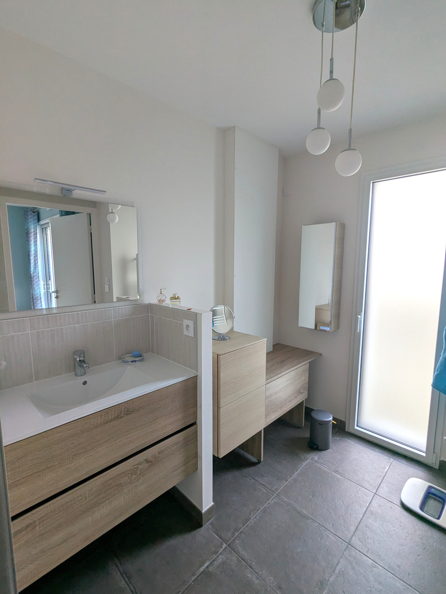 Un WC indépendant suspendu avec lave-mains complète ce niveau.