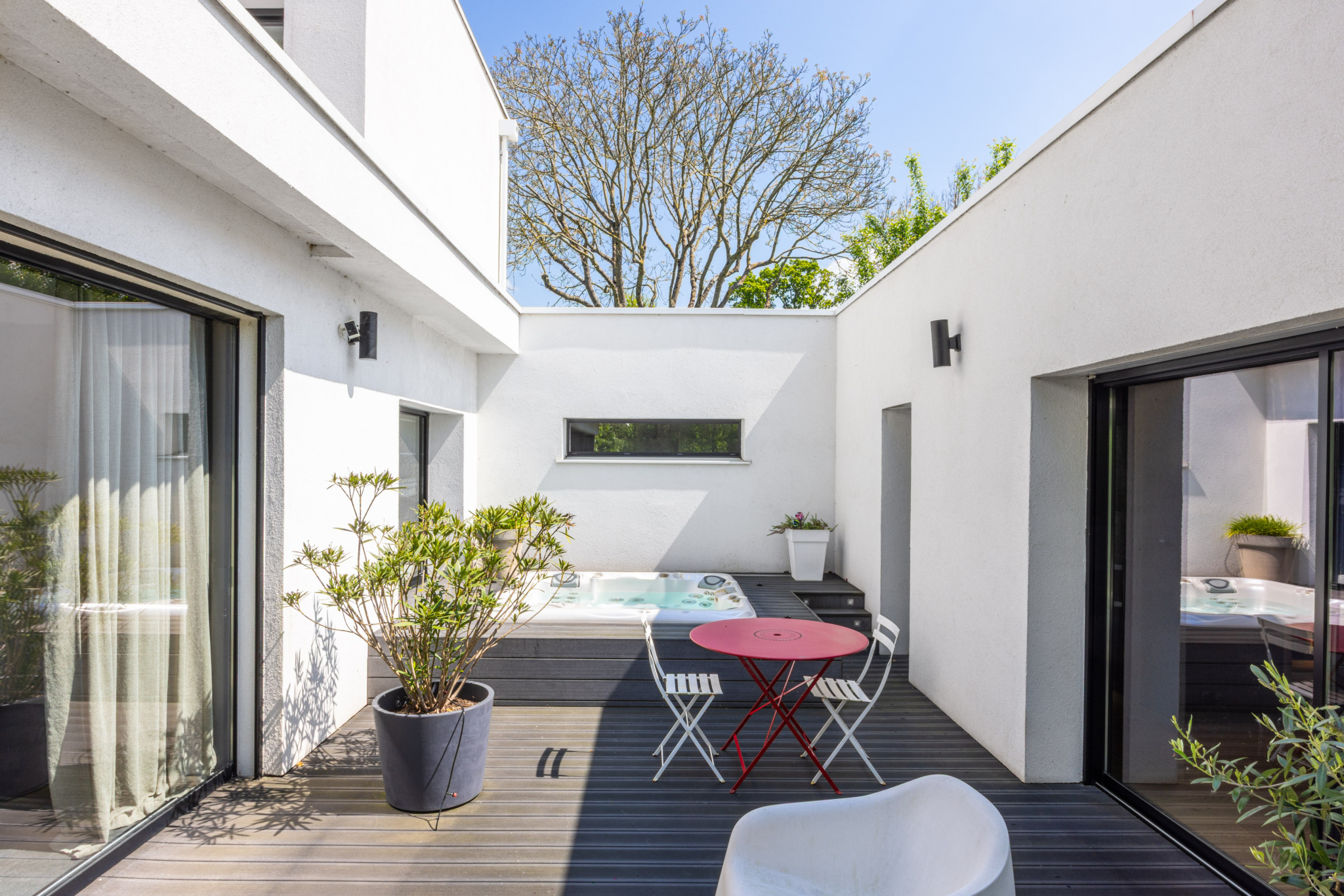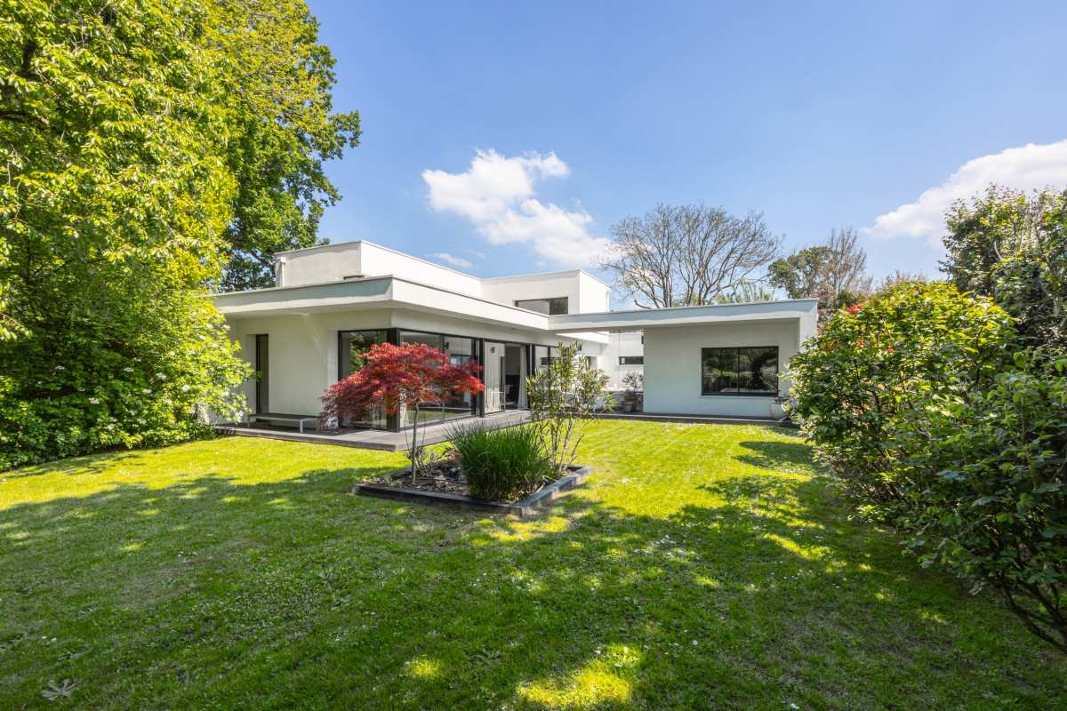 La vaste pièce de vie est baignée de lumière grâce à 10 mètres de baies vitrées. Elle s'ouvre sur un jardin préservé et une terrasse intime avec SPA, sans aucun vis à vis. Un cadre idéal pour partager de beaux moments en famille ou entre amis.