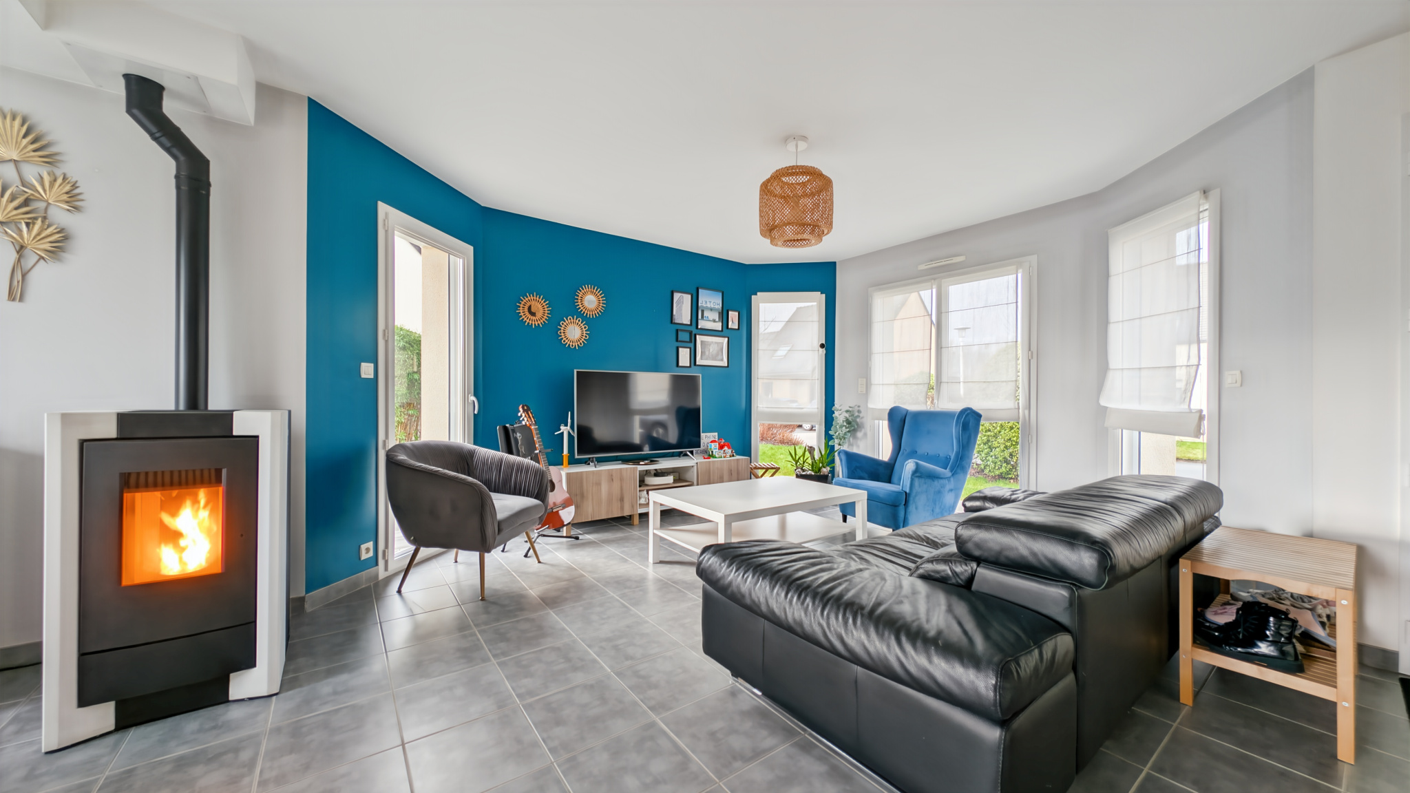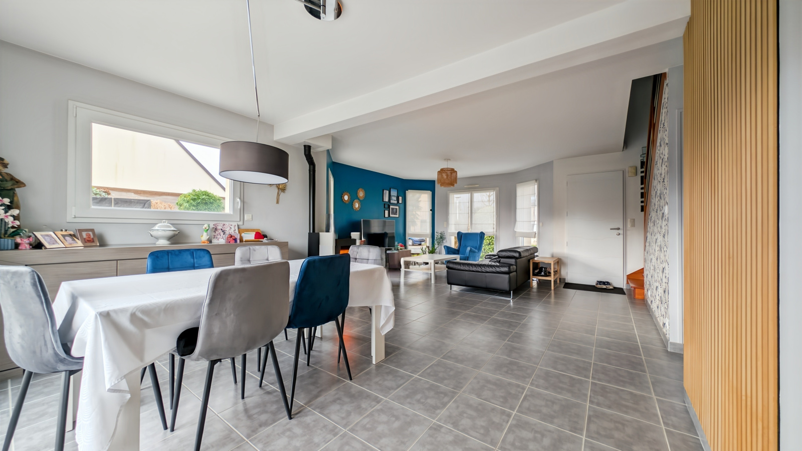 Au rez-de-chaussée, la maison propose une belle pièce de vie lumineuse de 48 m² avec séjour et cuisine aménagée et équipée, idéale pour les moments en famille ou entre amis.