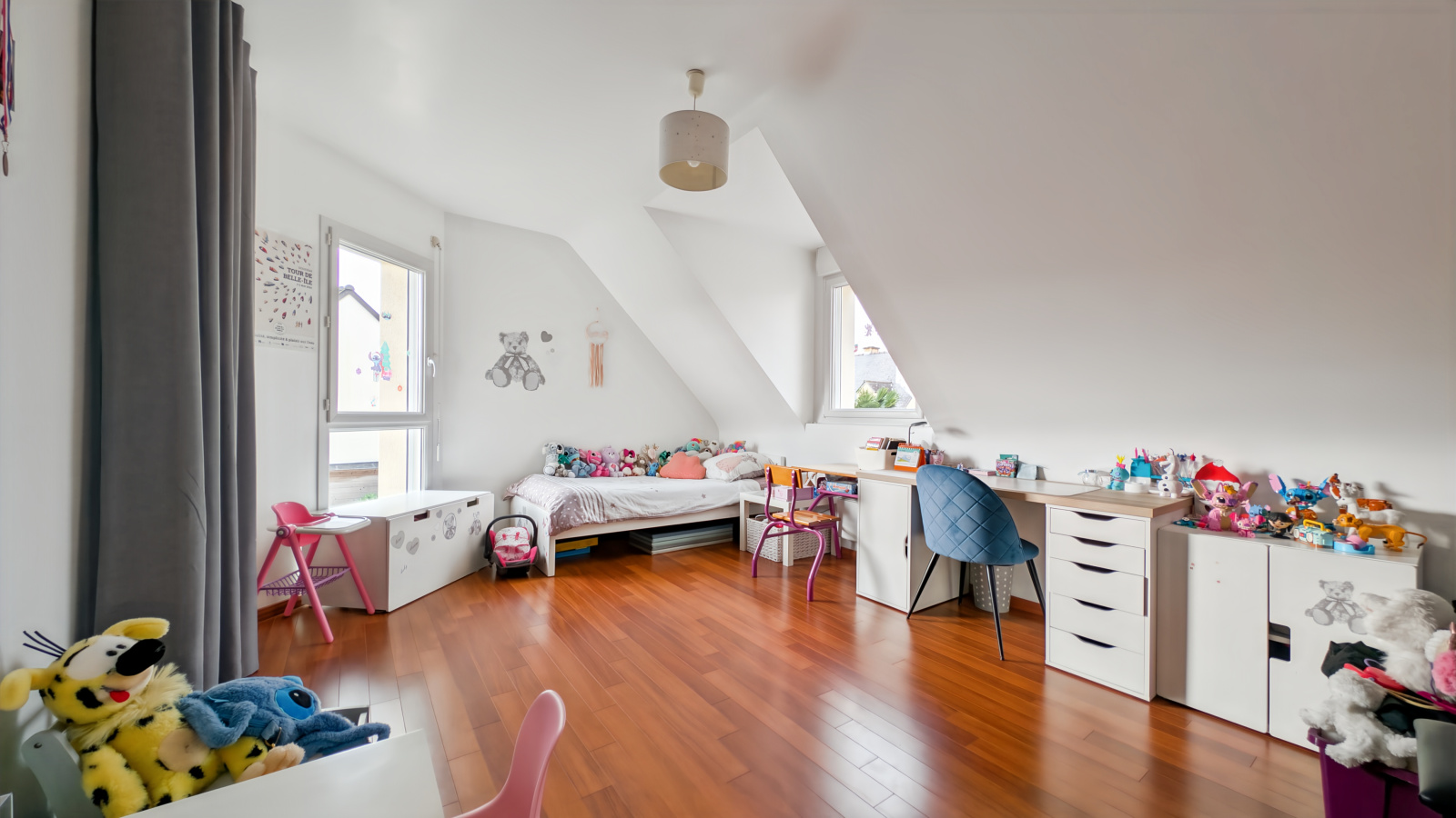 À l’étage, une belle mezzanine distribue 3 chambres, une salle de bains et un WC séparé, offrant un espace nuit confortable.