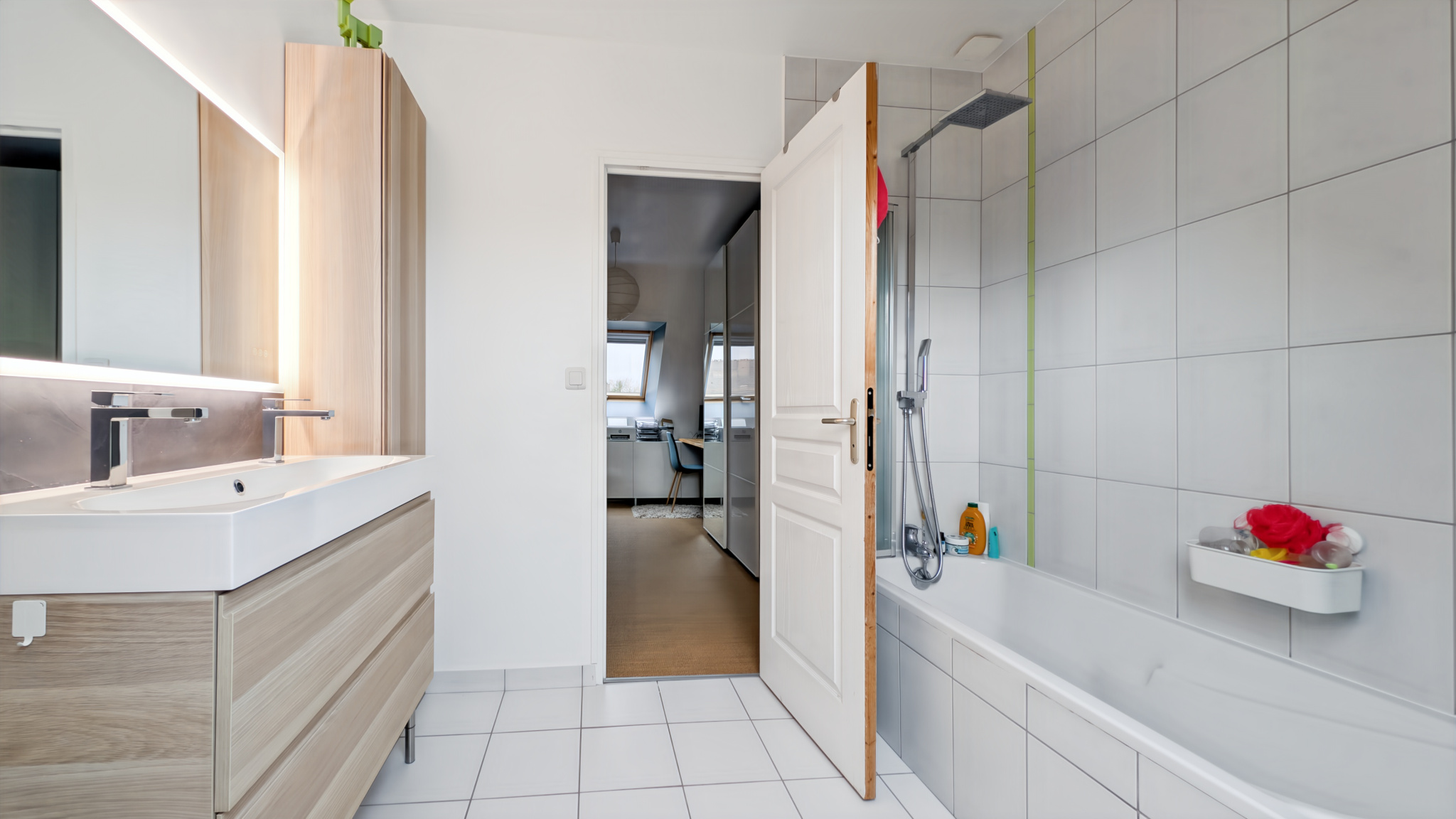 Un dégagement dessert une chambre, une salle d’eau et un WC indépendant.