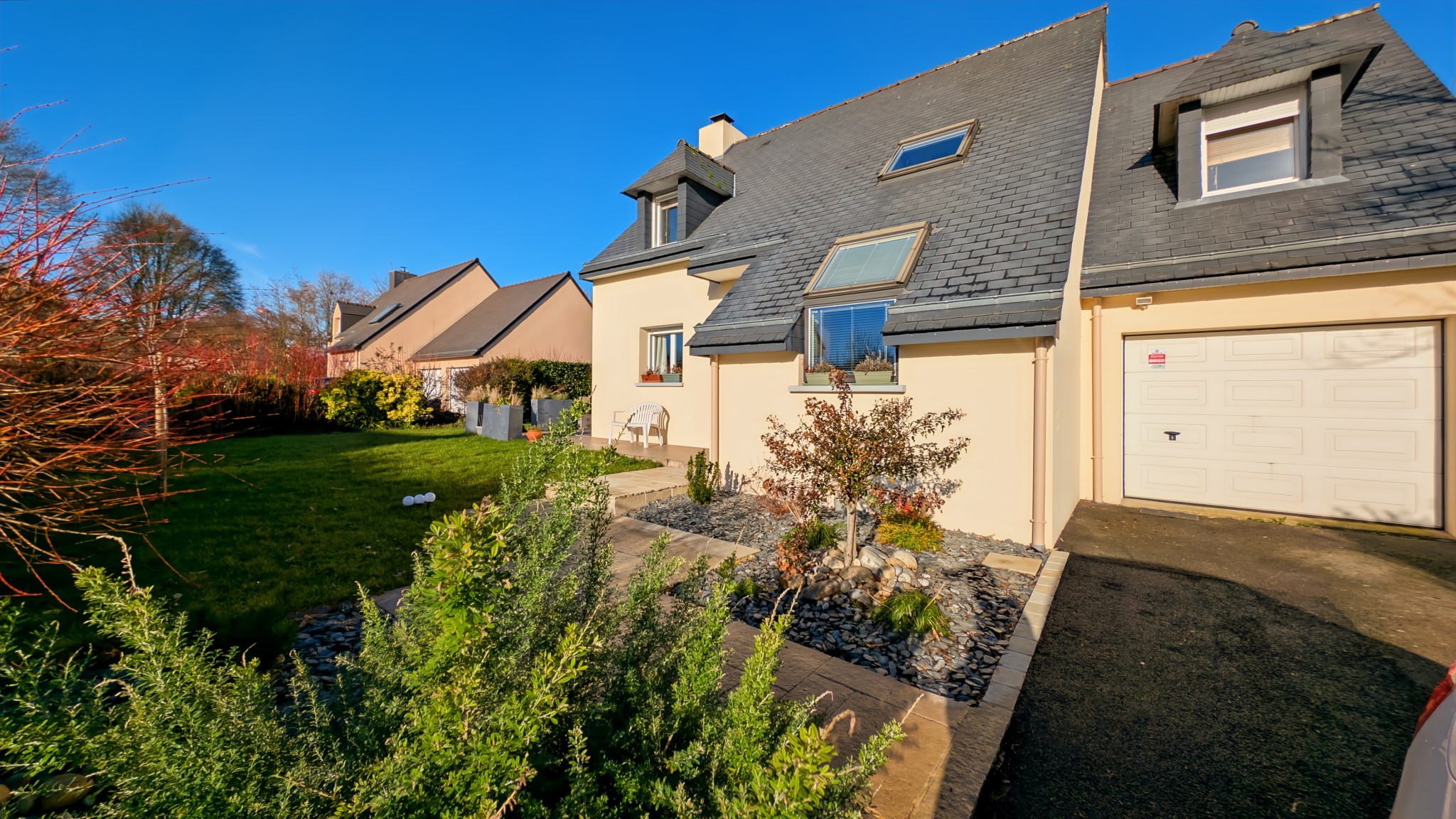 À l’extérieur, le jardin est complété par un cabanon de jardin, pratique pour le rangement.