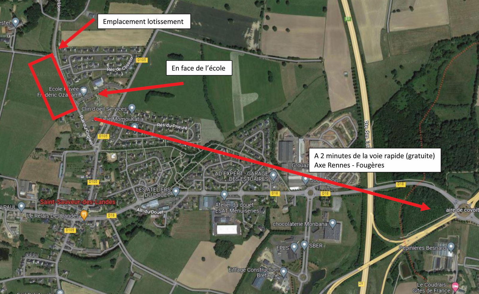 Les Hauts du Bourg, c’est le nom du nouveau lotissement de Saint-Sauveur des Landes. Cette nouvelle opportunité d’habitation est la preuve du dynamisme de la commune que son implantation explique en partie. En effet, si vous ne connaissez pas l’endroit et que vous êtes en recherche d’un lieu attractif, à la fois pour le prix et la situation géographique, sachez que St-Sauveur est à seulement 2 minutes de l’accès à l’autoroute A84 et de l’aire de covoiturage et aussi à 7 km de Fougères, la grande ville principale (21 000 habitants). Par exemple, vous travaillez dans le bassin rennais mais s’y installer coûte très cher, eh bien l’échangeur 29 (entrée et sortie Saint-Sauveur des Landes) est à seulement 20 minutes de Rennes (durée calculée par Michelin).
