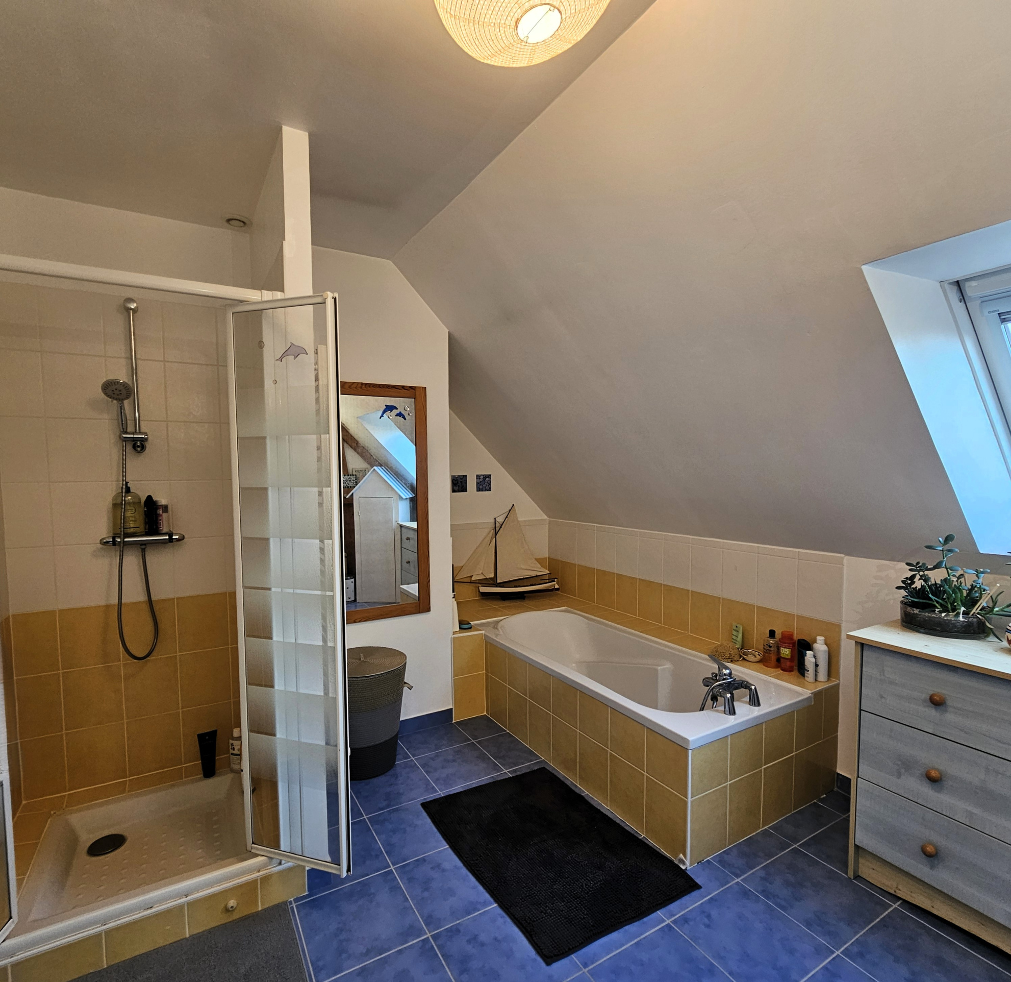 L'étage est composé d’une mezzanine de 15 m2, de quatre grandes chambres équipées de placards, d’une salle de bain de 9m2 avec une baignoire, une douche et double vasque. Le WC de l’étage est indépendant. Vous disposez aussi d’un grenier avec vélux, en partie aménagé, de près de 18 m2, idéal pour une suite parentale, une salle de sport, de musique ou autre.