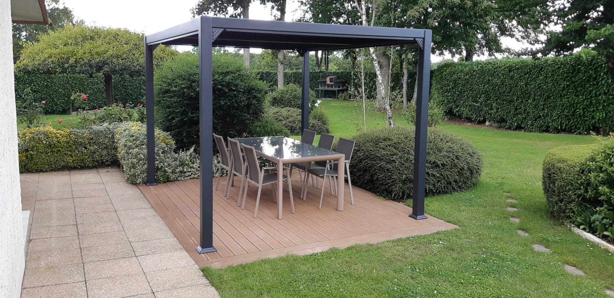 En été, vous profitez de la fraîcheur naturelle de la maison et de la terrasse équipée d'une pergola bioclimatique, tournée vers le jardin fleuri et parfaitement clôturé.