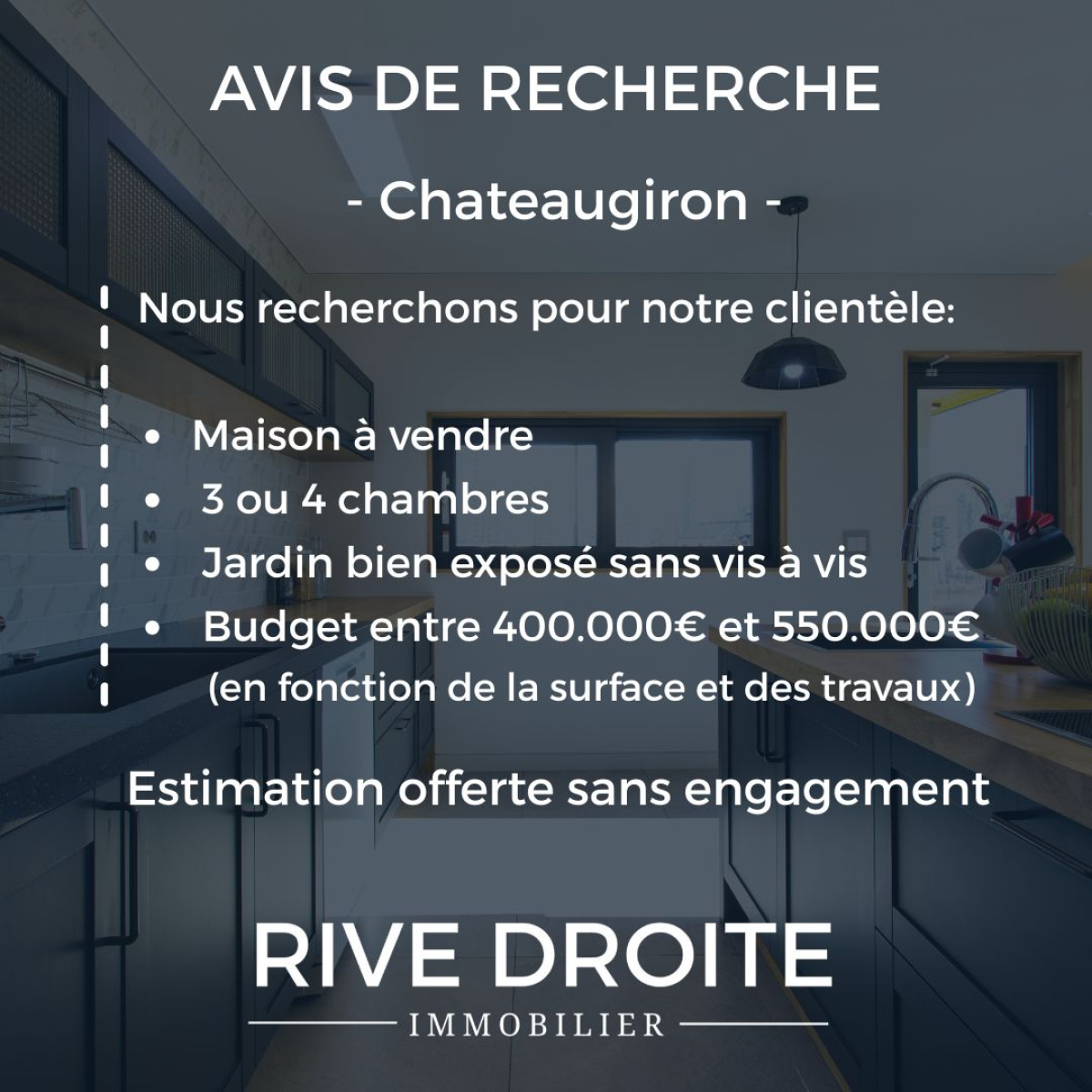 RIVE DROITE Agence de RENNES - Nous recherchons activement des maisons à vendre à CHATEAUGIRON pour le compte de notre clientèle en recherche active sur ce secteur. Critères de recherche: Situation géographique proche du centre, des transports et écoles - Environnement calme - Maison 3 ou 4 chambres - Travaux de raffraichissement acceptés - Budget entre 400.000€ et 550.000€ selon surface, emplacement, et travaux à réaliser. Vous avez un projet de vente ? ESTIMATION OFFERTE SANS ENGAGEMENT -Â