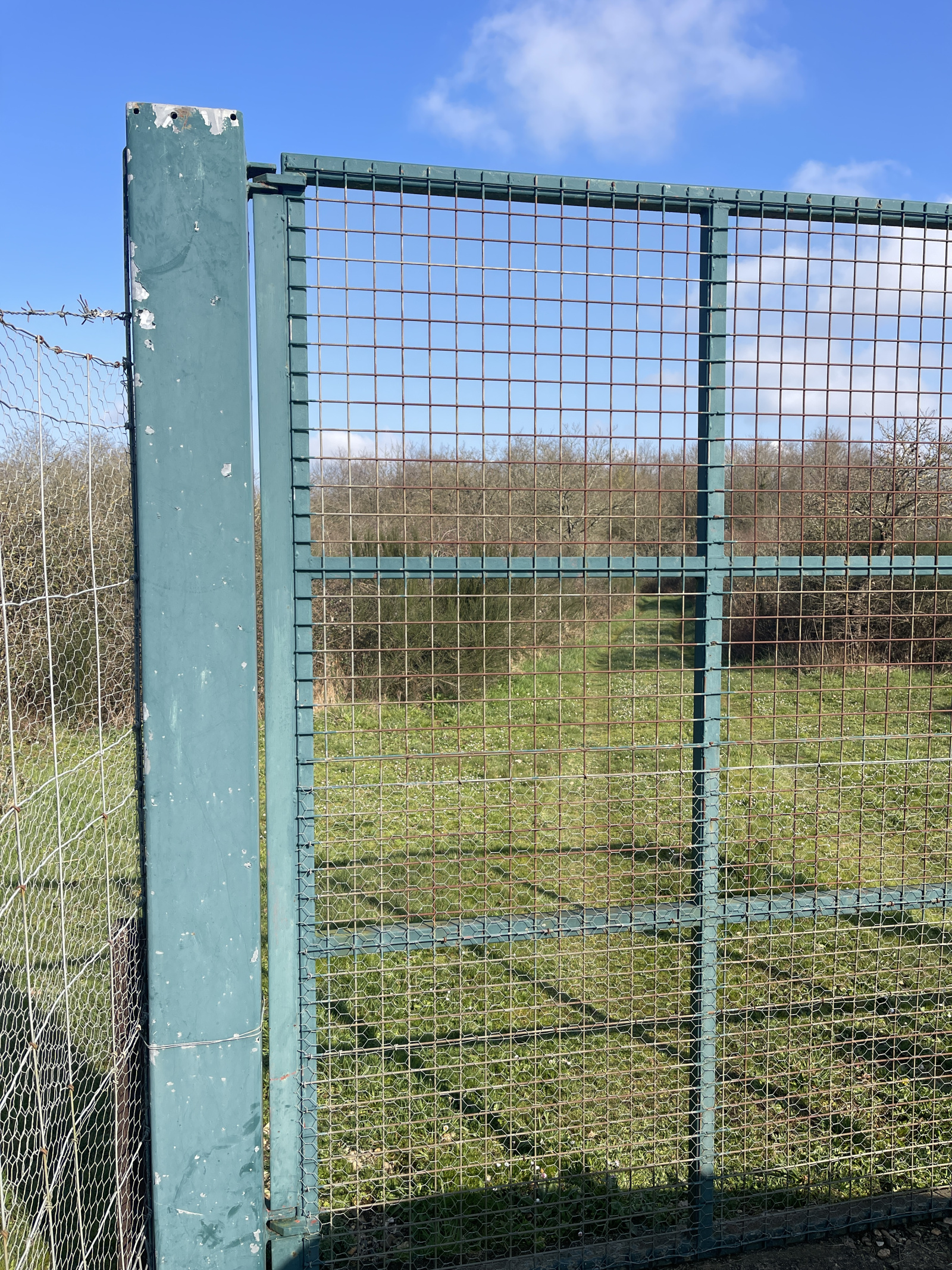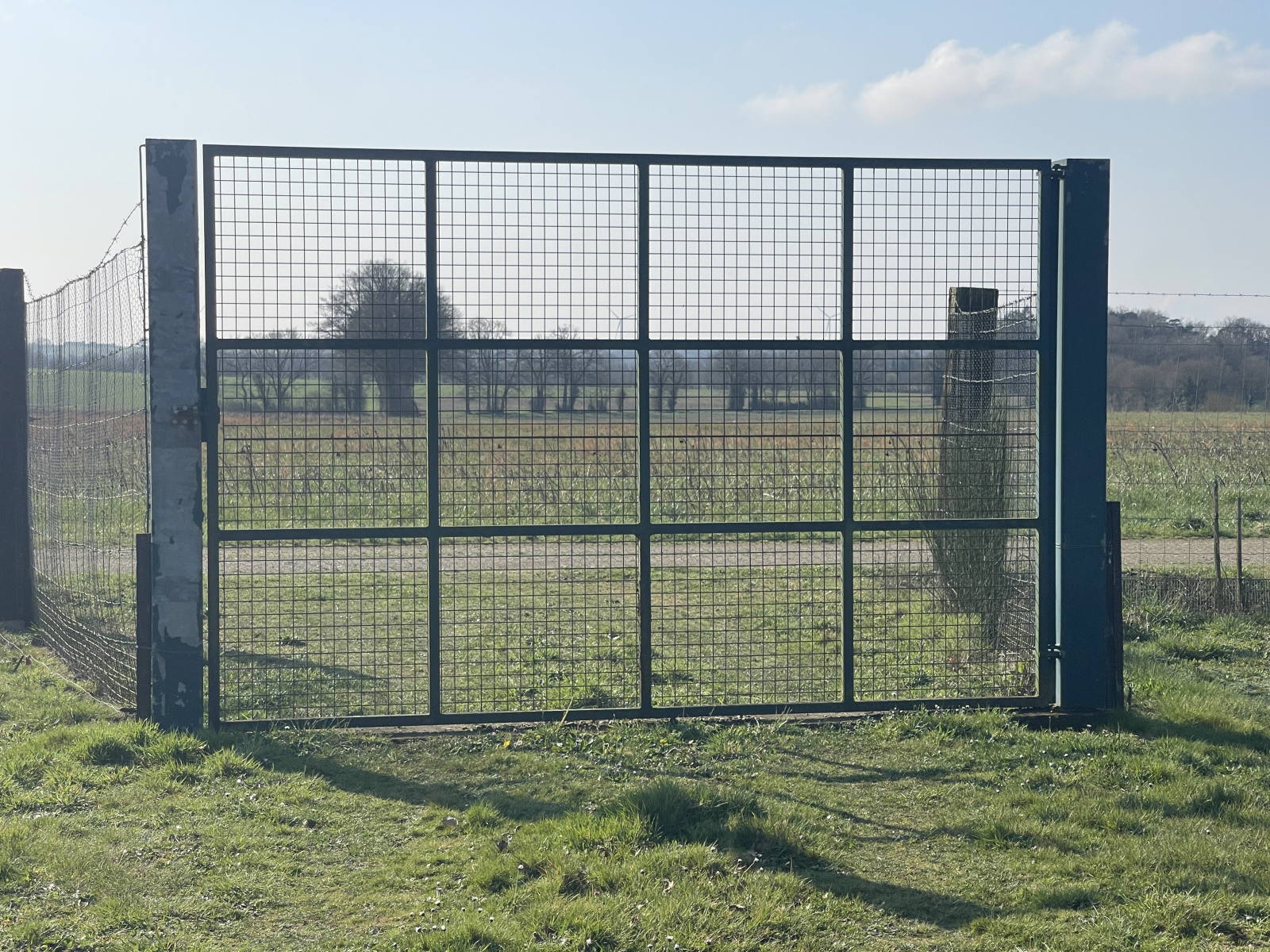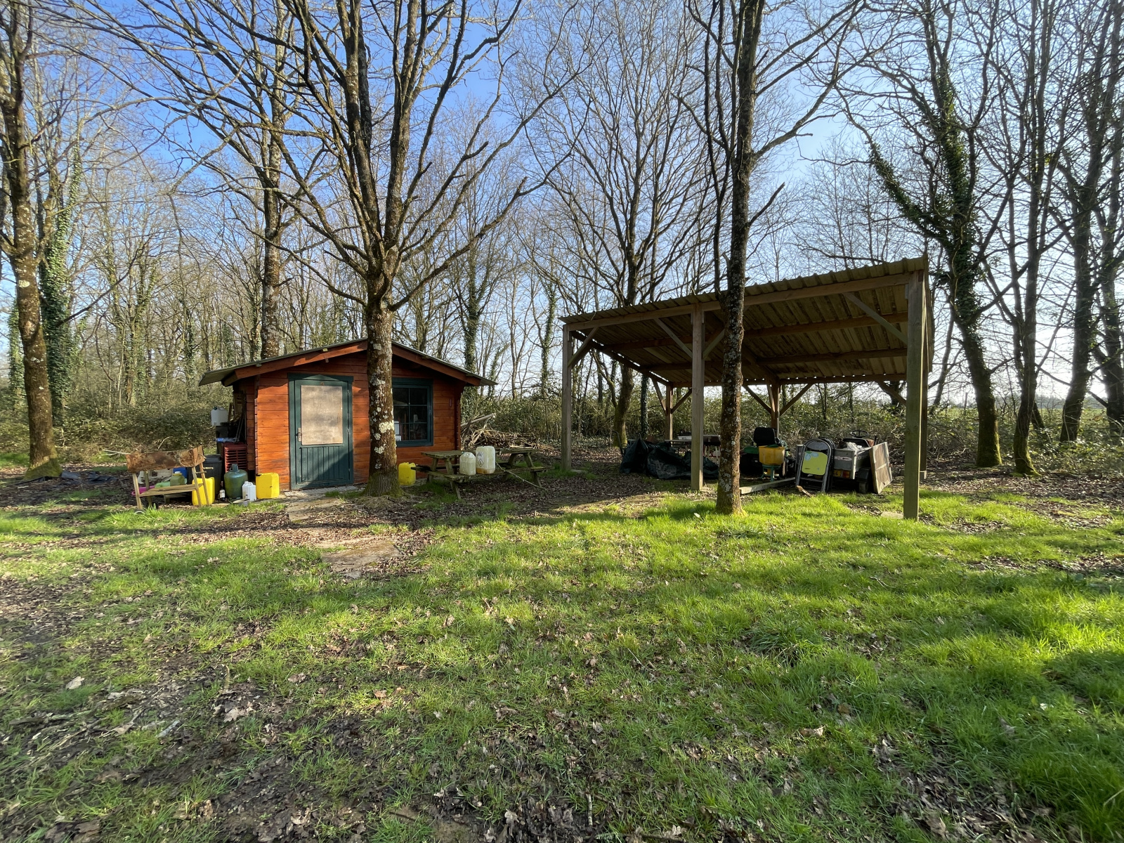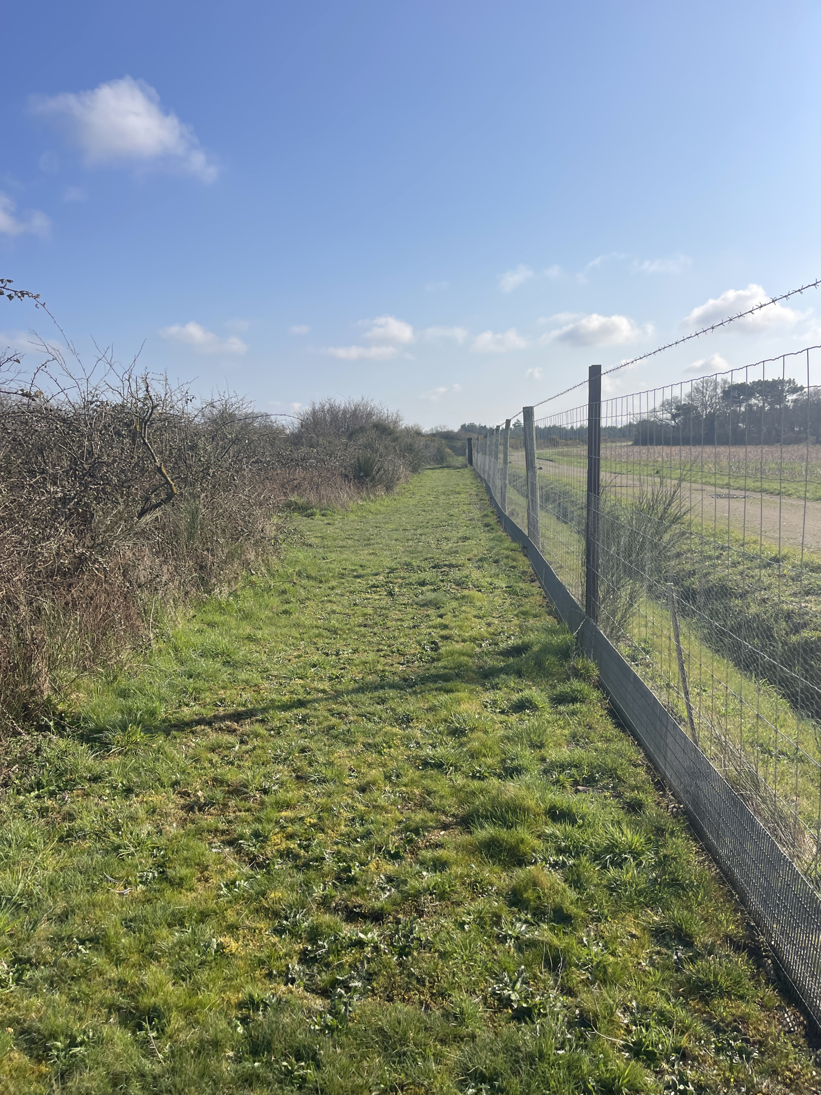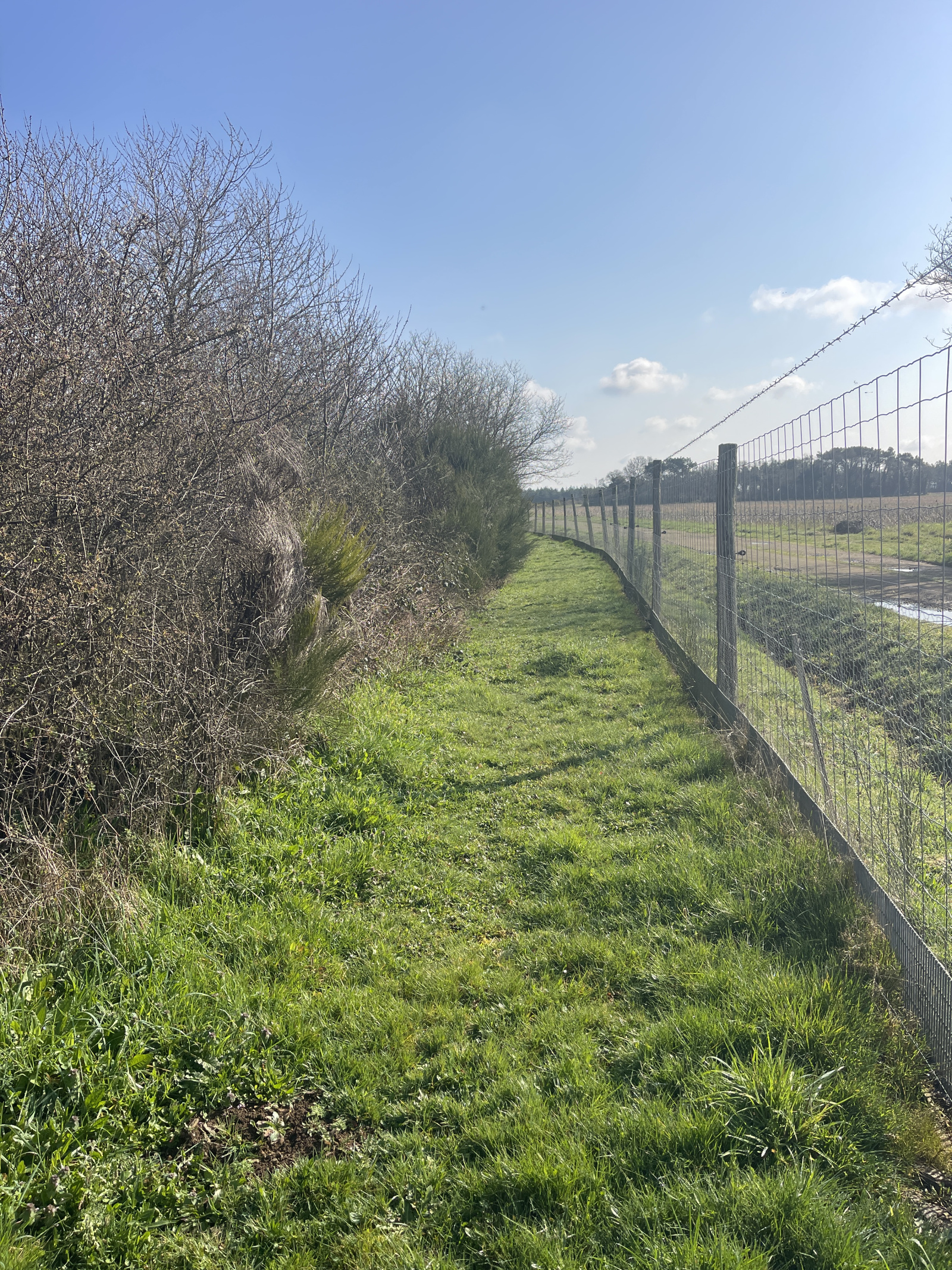 Terrain entièrement clôturé de 2 m de haut par un grillage renforcé en bas par un grillage a petit trou, arboré (forêt).