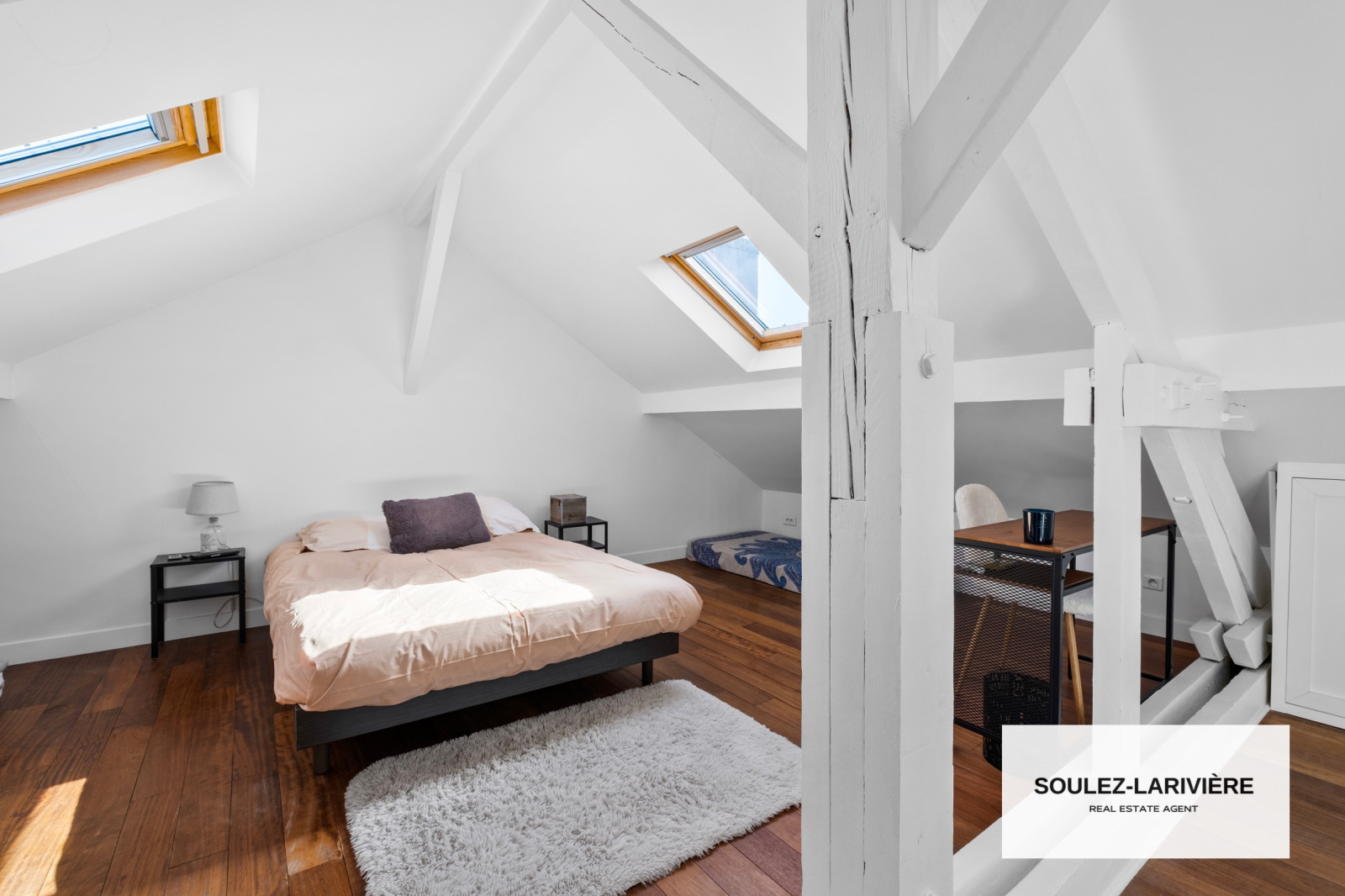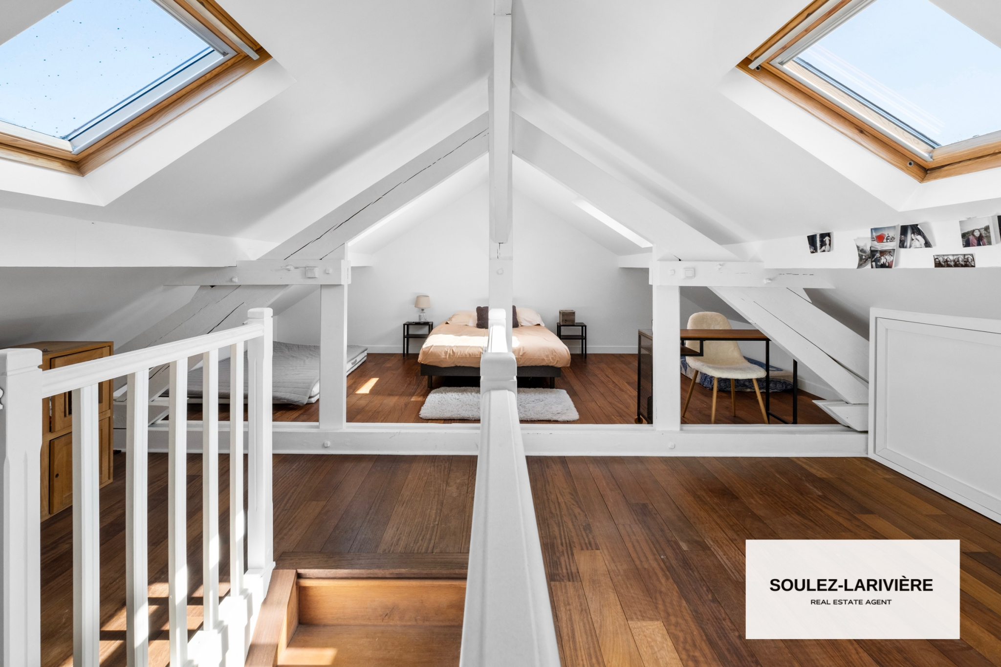 Au deuxième et dernier étage, une grande chambre sous comble de plus 25 m2 au sol, lumineuse grâce aux velux qui viennent illuminer tout l’espace.