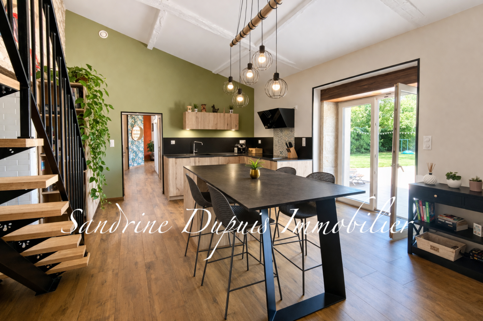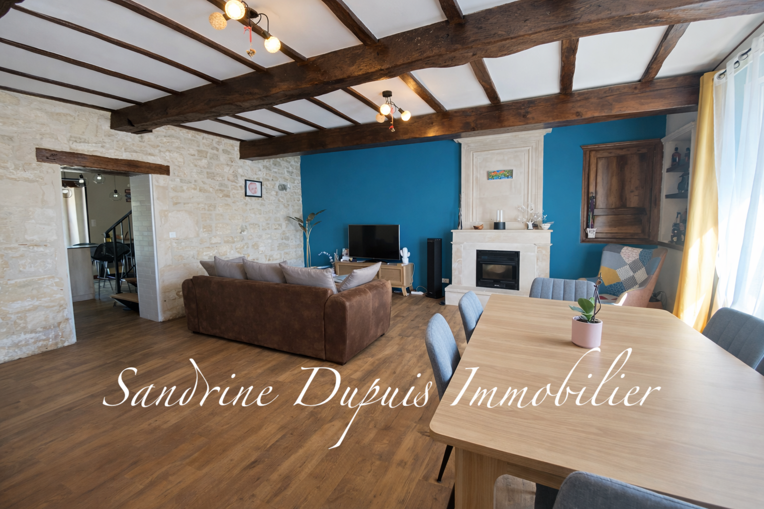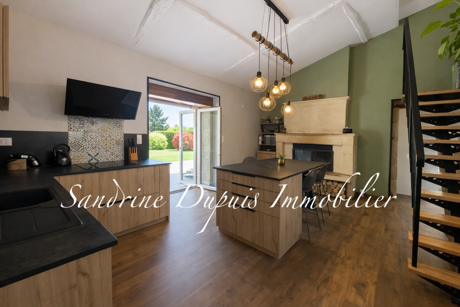 La pièce de vie, chaleureuse et lumineuse, se compose d’un salon / séjour avec insert à granulés. Dans son prolongement, la cuisine aménagée avec insert bois bénéficie d’un accès direct à la terrasse et au jardin, idéal pour une vie dedans-dehors agréable au quotidien.