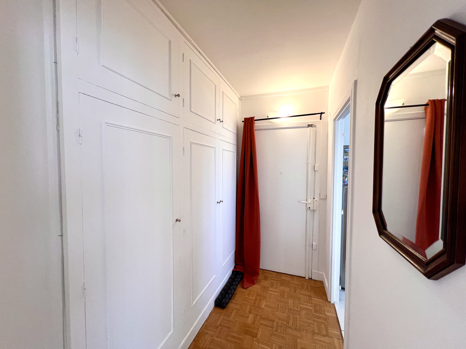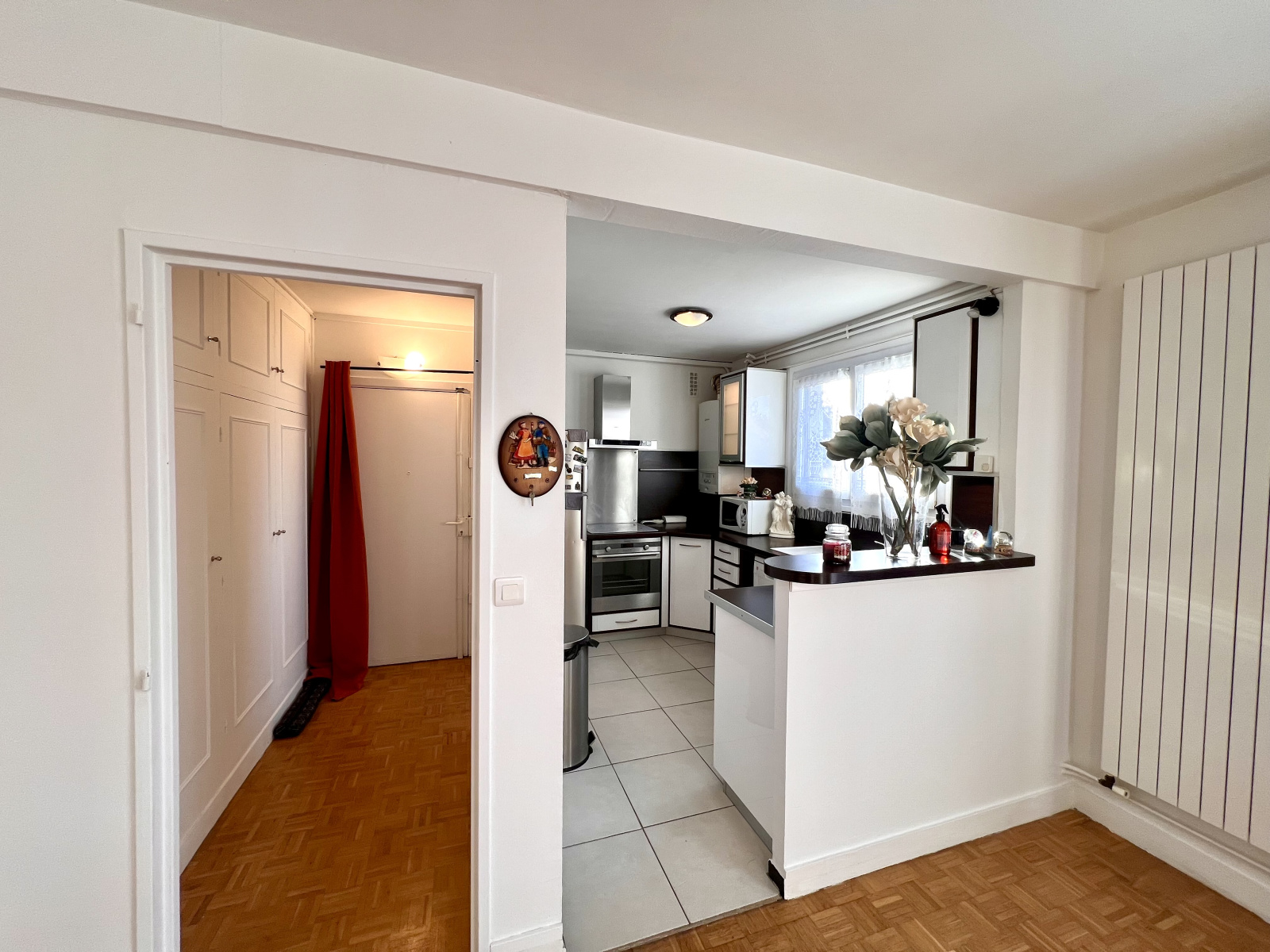 À l'intérieur vous retrouverez : une entrée avec placards, une cuisine équipée (four, plaque, hotte, frigo) semi-ouverte que l'on peut fermer, séjour avec balcon, 1 chambre avec placards, une salle d'eau, wc séparés