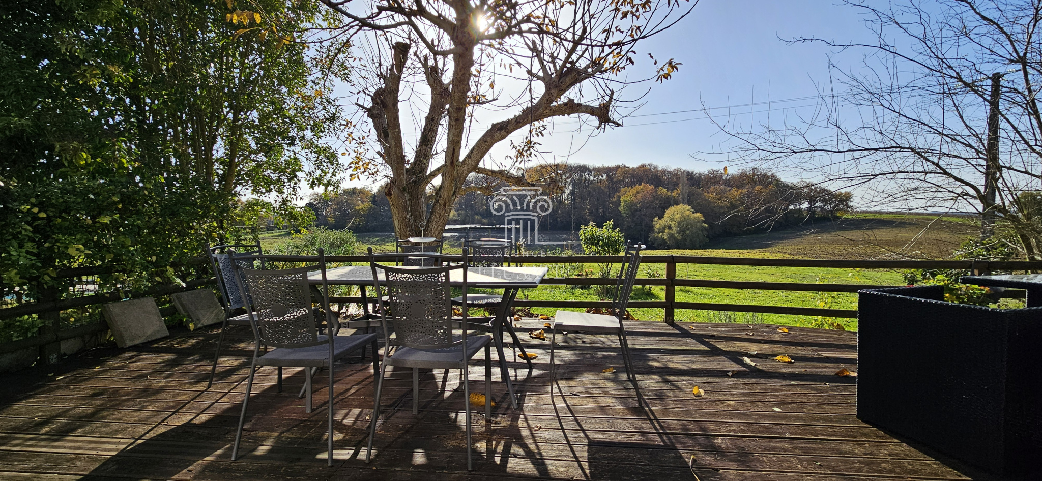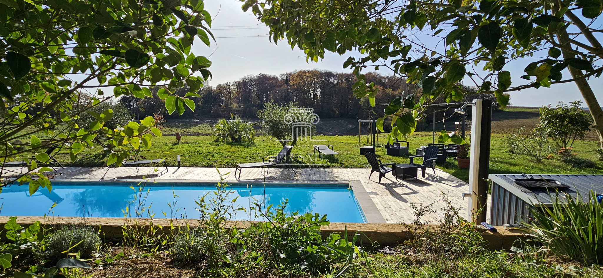 La pièce de vie chaleureuse et lumineuse comprend une cuisine ouverte entièrement équipée, parfaite pour des moments conviviaux. Une grande terrasse surplombant la piscine prolonge cet espace, offrant un cadre idéal pour les repas ou la détente avec une vue imprenable sur la campagne environnante.
