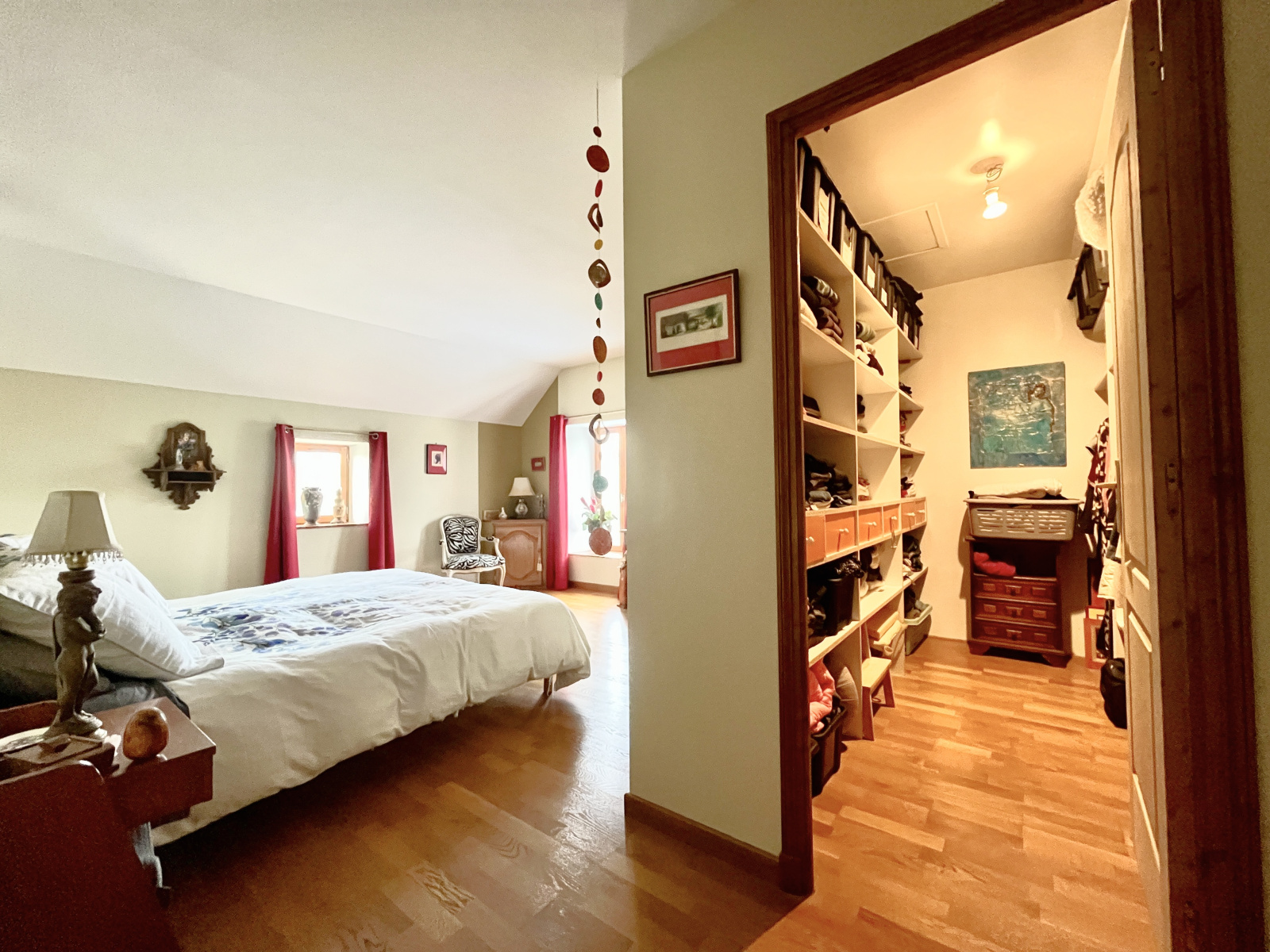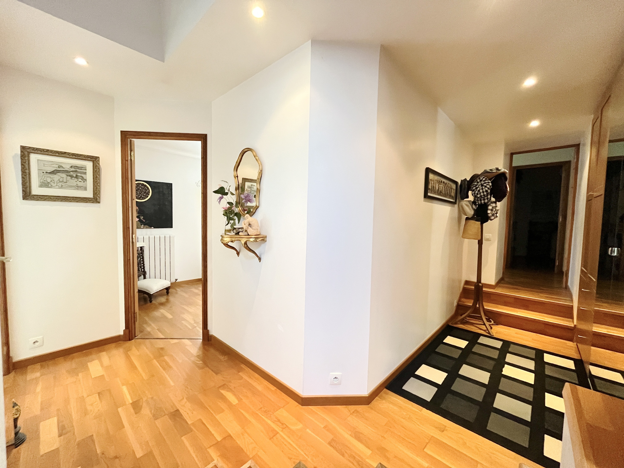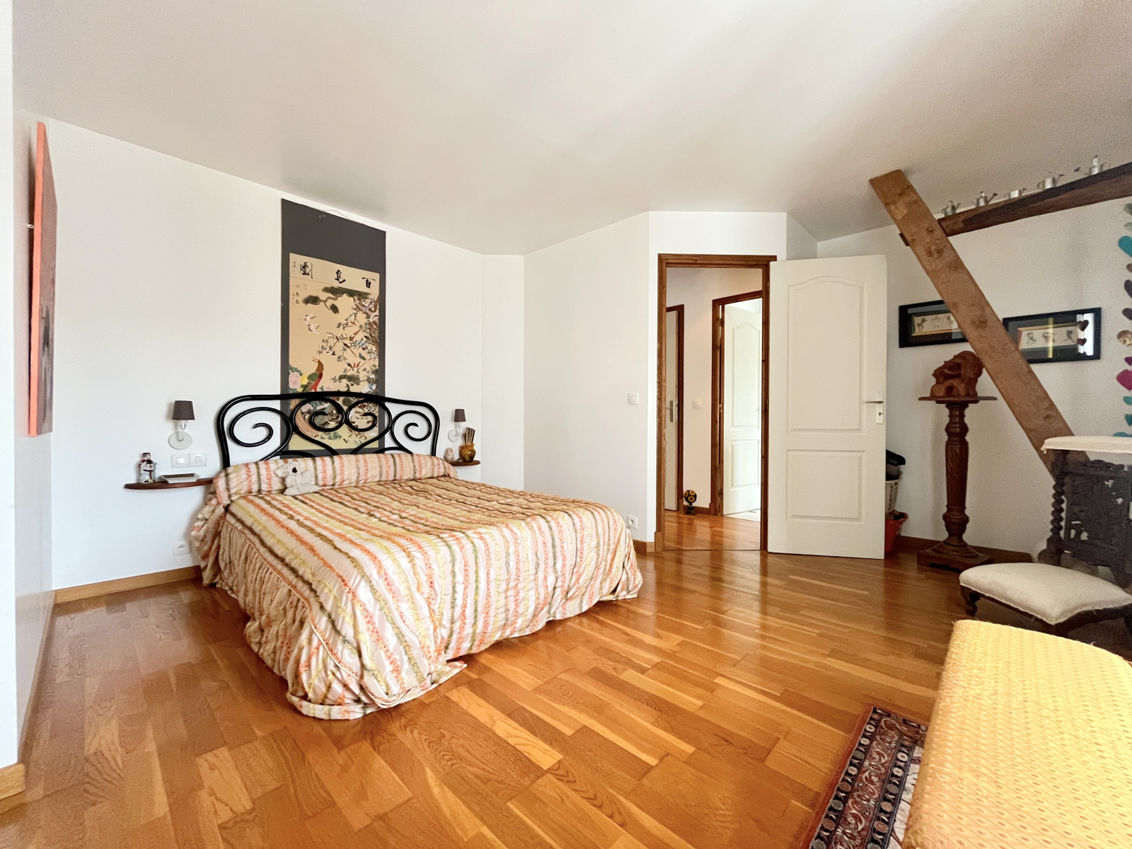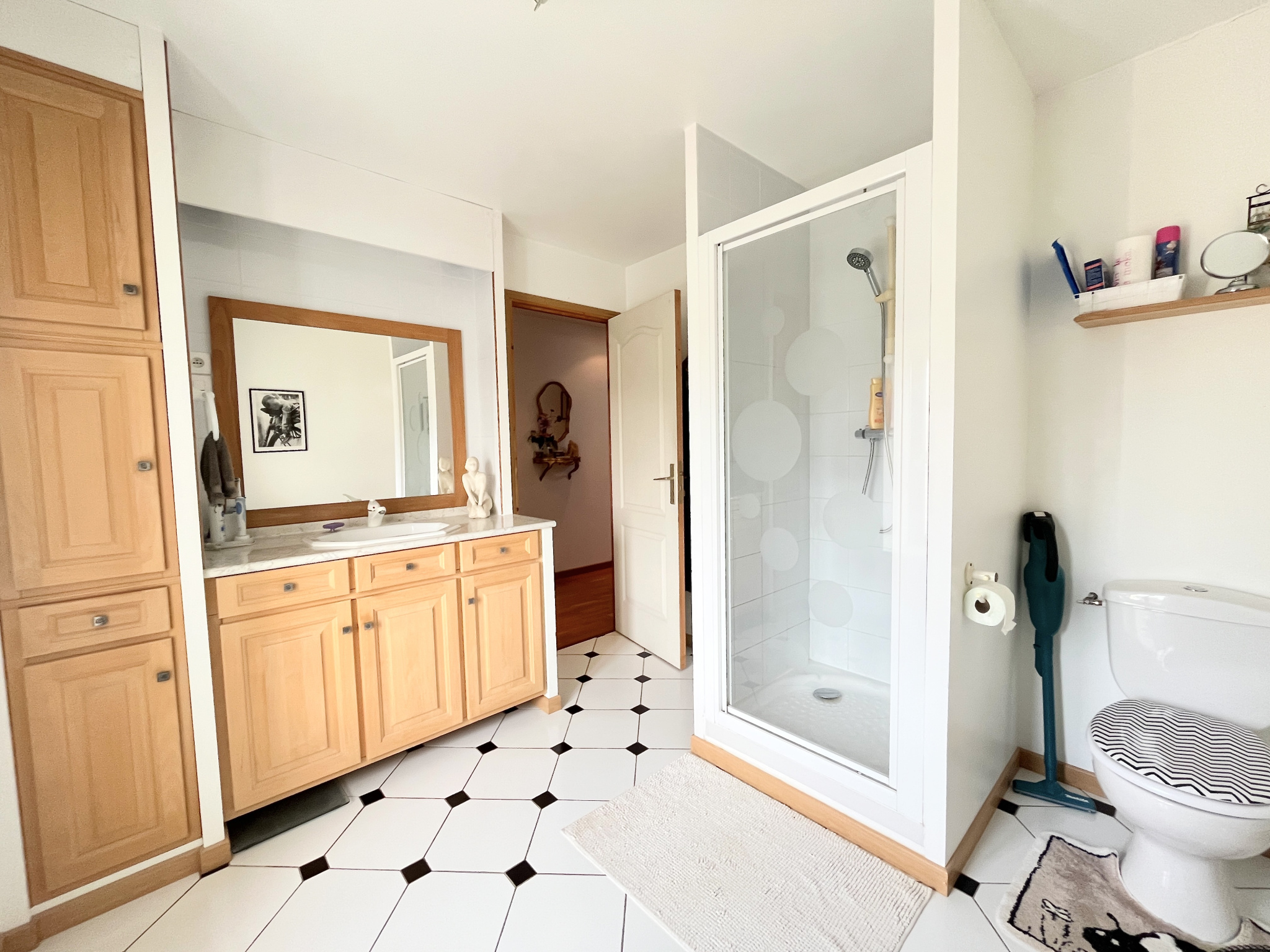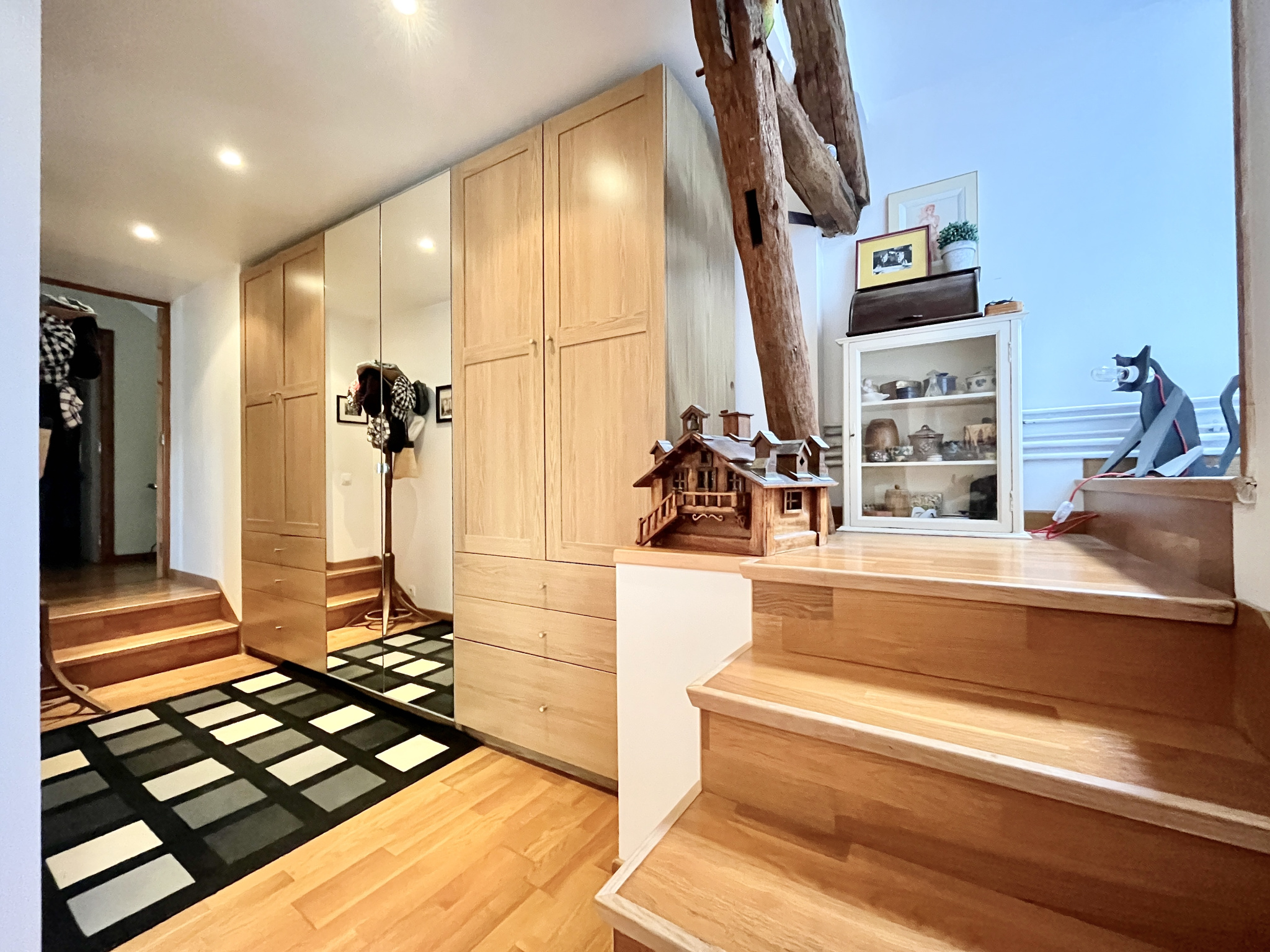 À L'ÉTAGE : un joli palier avec placard desservant une salle de bain avec WC, deux grandes chambres dont l'une mesure 25 m² et dispose d'un dressing, une seconde salle d'eau avec WC ainsi qu'une troisième chambre.