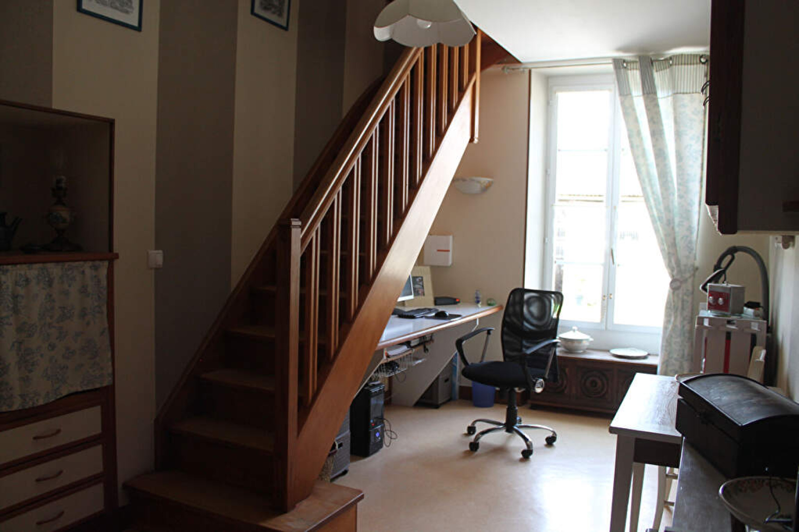 La longère se compose au RDC d'une entrée sur séjour, lumineuse avec son coin salon de 36 m², une cuisine aménagée et équipée, d'une chambre, d'une pièce palière pour accéder au premier étage, d'une salle de bains, à remettre au goût du jour, WC et d'une buanderie très utile.