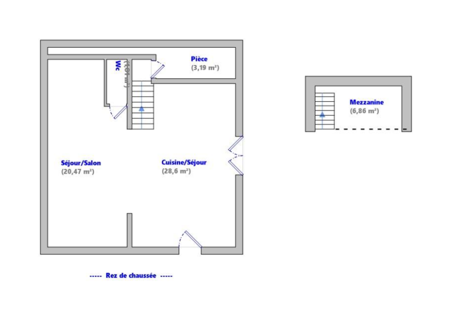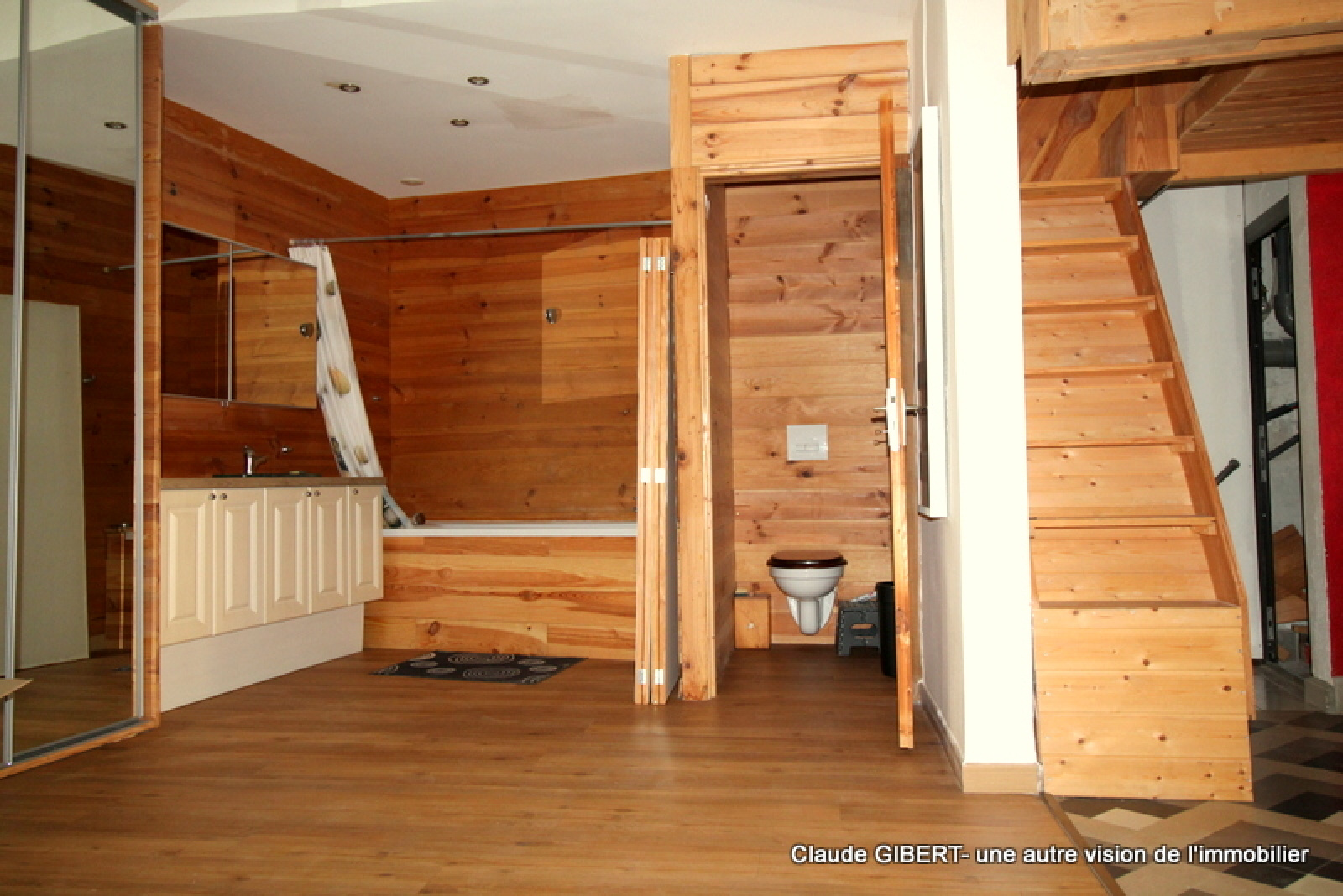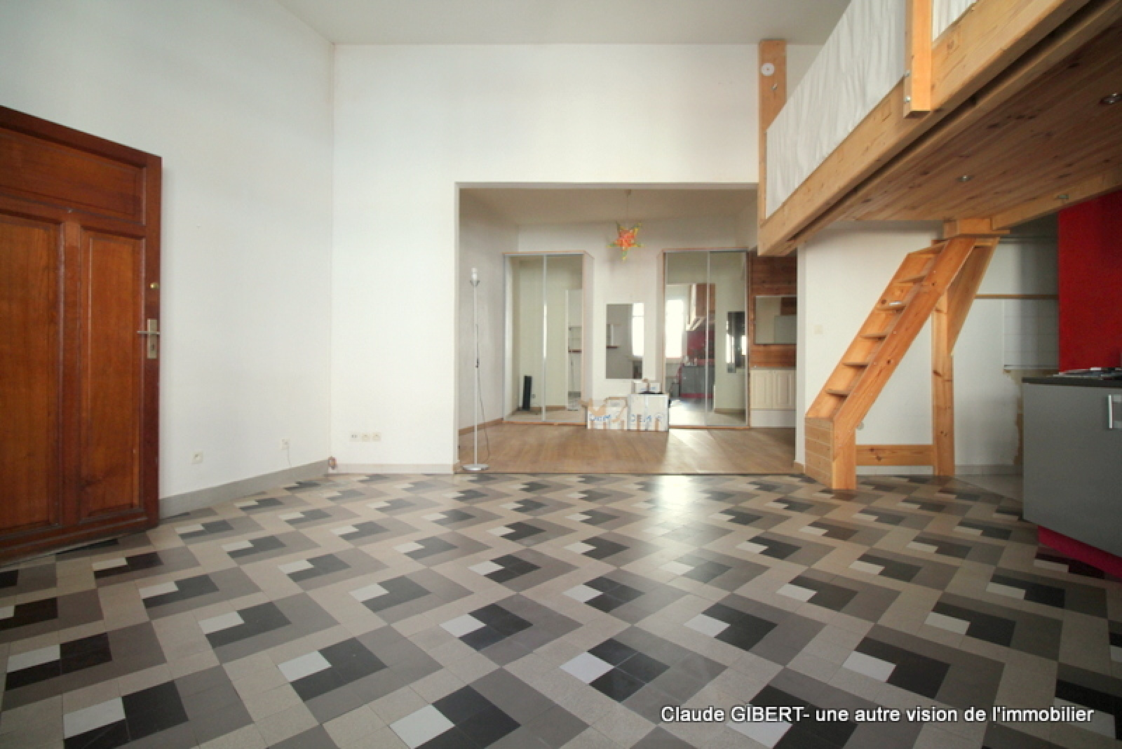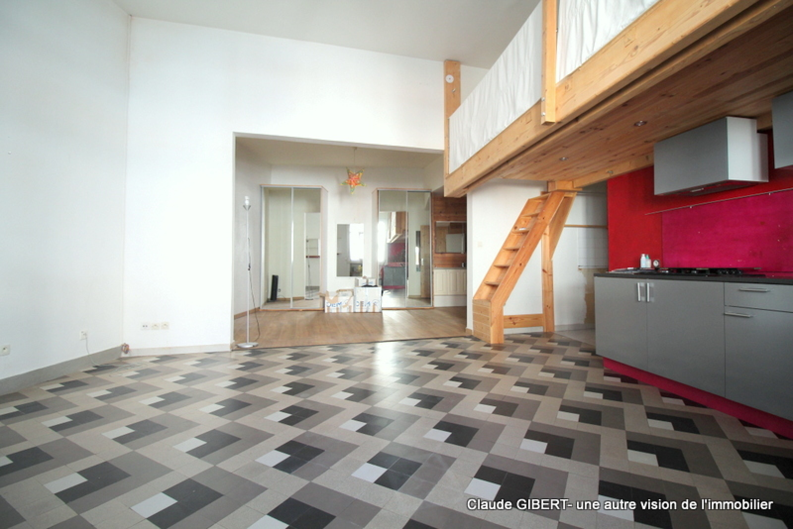 Vous entrez dans la pièce principale (cuisine /séjour) avec mezzanine et vous avez ensuite la partie chambre, salle de bains, wc.