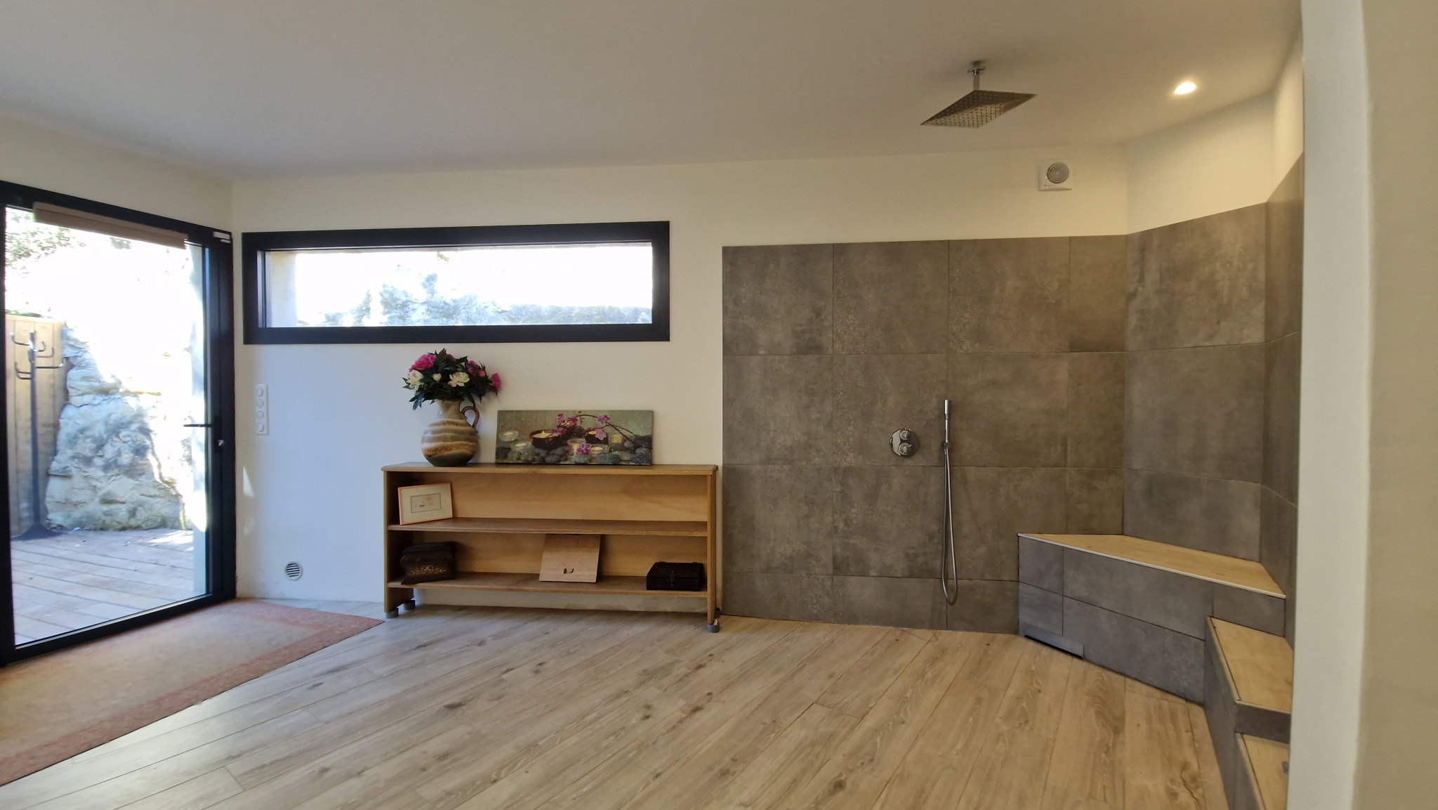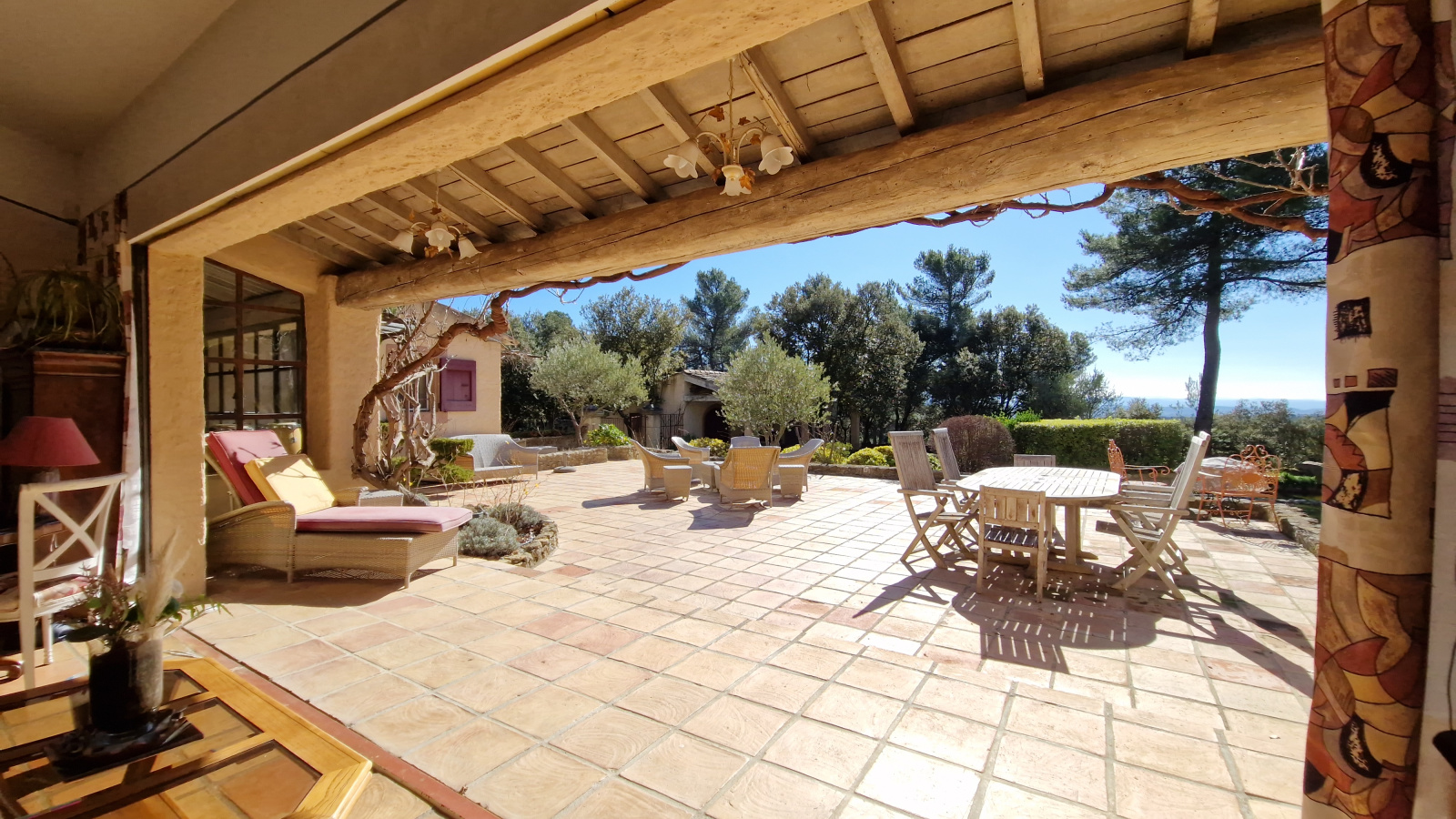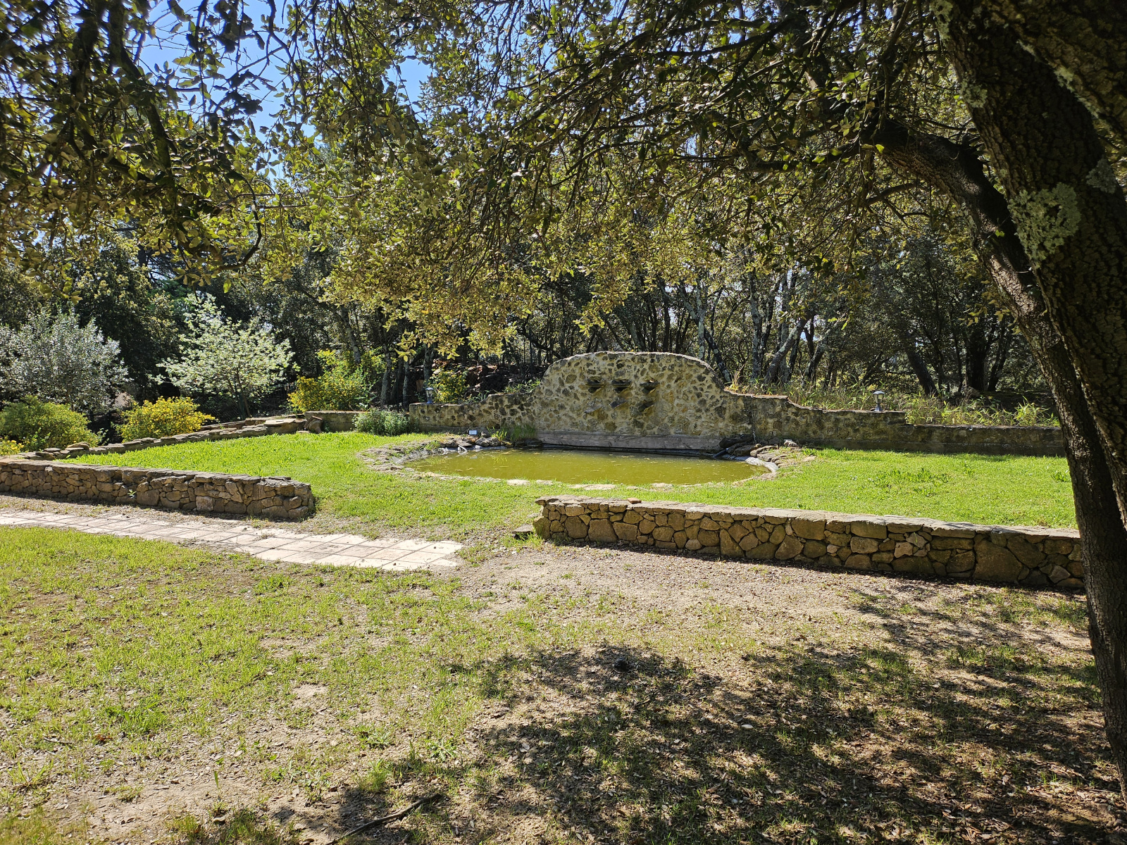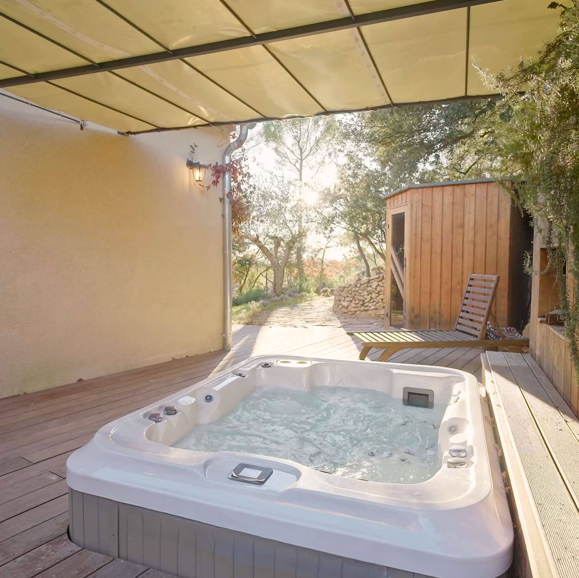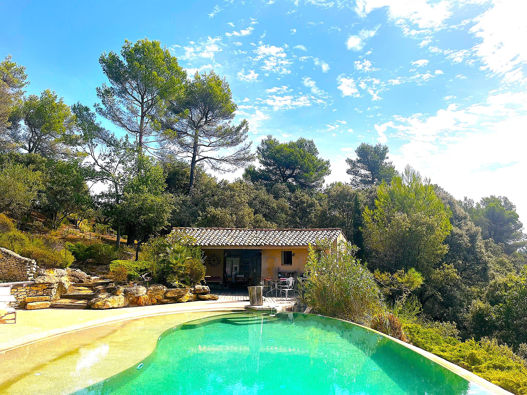 Les extérieurs ont été conçus comme un véritable prolongement des espaces de vie. Le pool-house, avec hammam, douches, pièce à vivre et coin cuisine, accompagne une piscine chauffée à débordement, un bassin en pierre agrémenté d’une fontaine et un étang qui participent à l’atmosphère paisible du lieu. Plusieurs terrasses ombragées, parfaitement intégrées au paysage, invitent à profiter pleinement de l’environnement provençal.