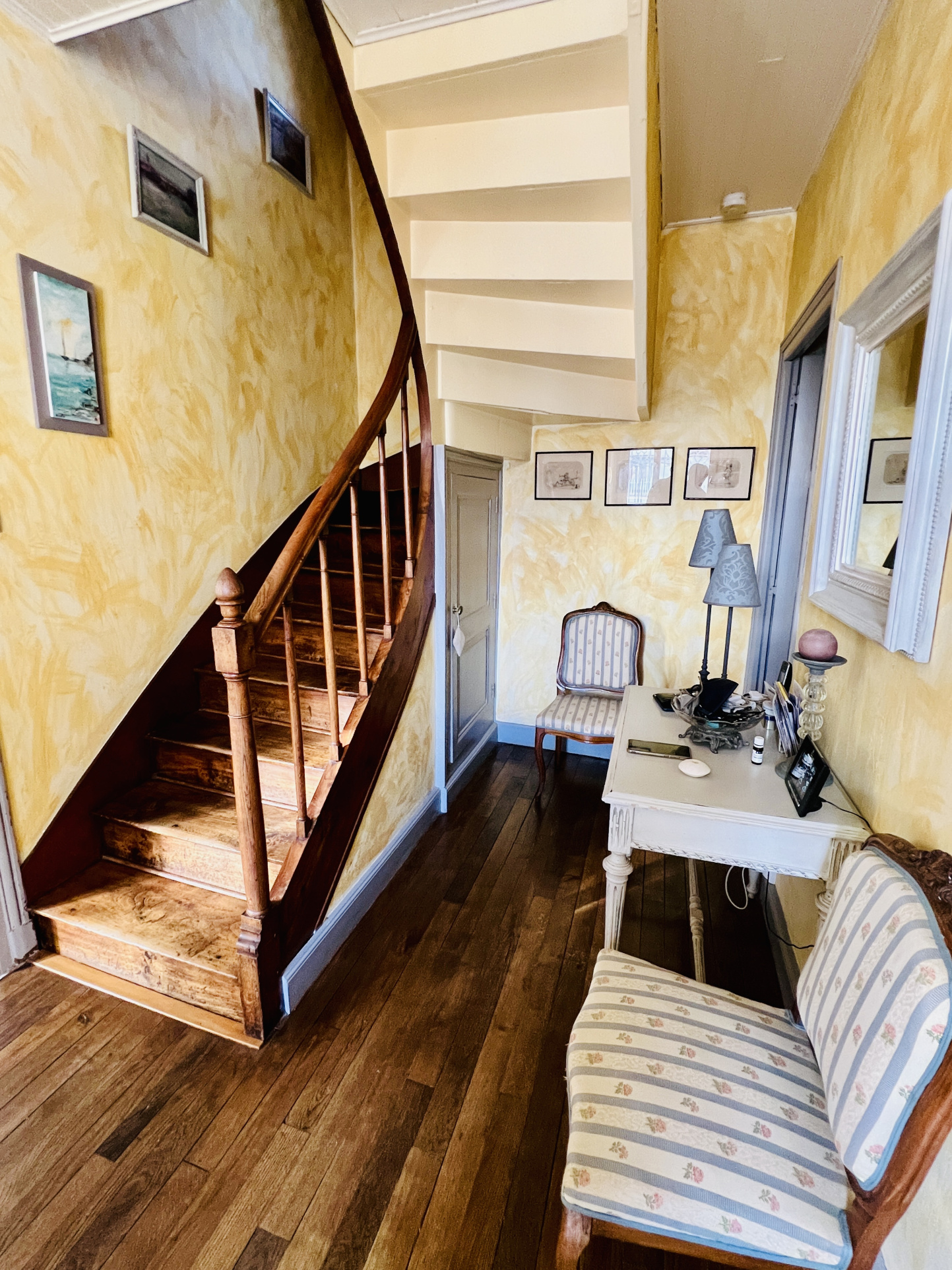 Au premier étage, un pallier dessert 2 belles chambres sur parquet, une salle d'eau avec wc récemment rénovée.