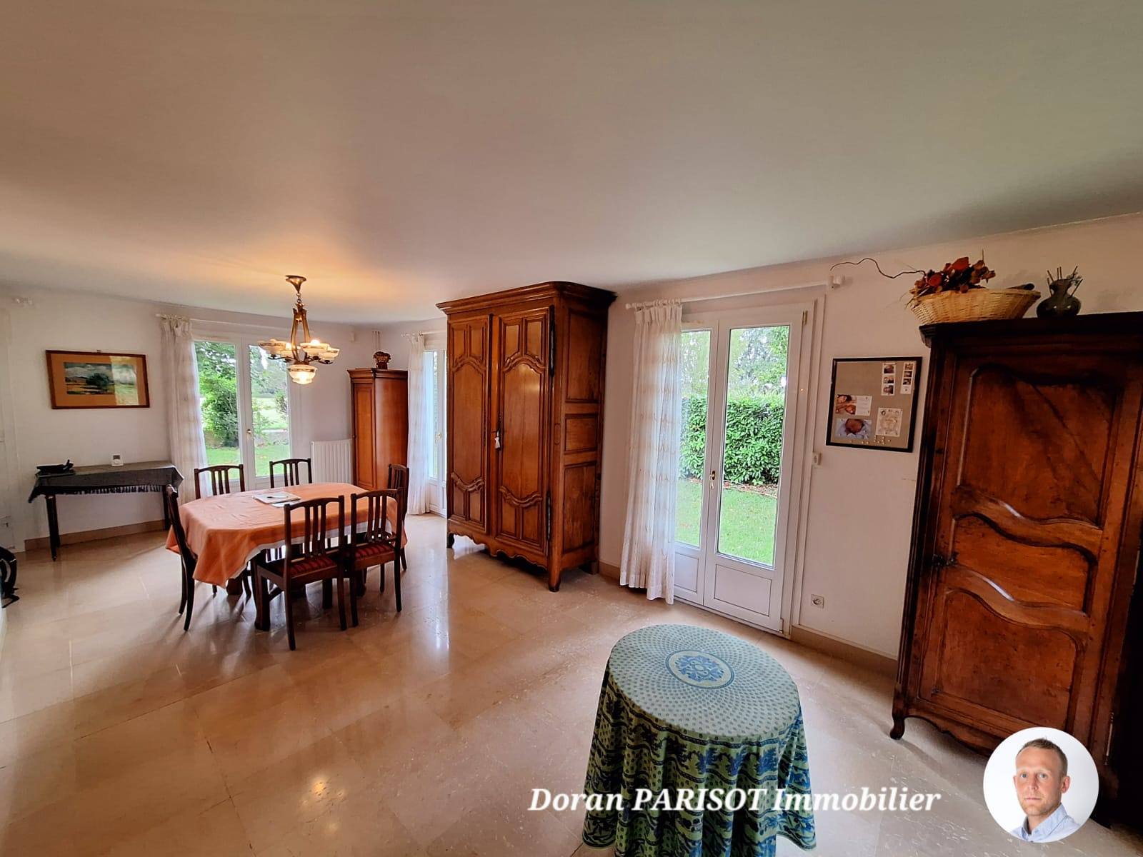 Elle se compose d’un grand salon-séjour lumineux de 47 m², d’une cuisine séparée à rafraîchir, de trois chambres dont une avec espace douche, d’un bureau, d’une salle d’eau à moderniser et d’un double garage.