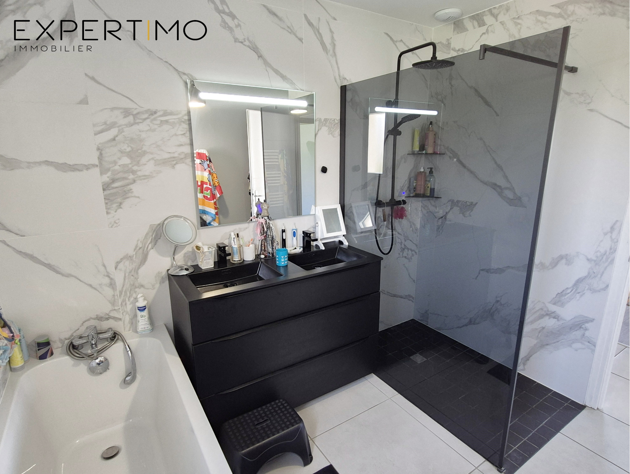 Dégagement, espace nuit : avec 3 chambres de 11 à 12 m² avec dressing (placards + penderie) sur tout un côté de mur, wc séparé avec lave mains, salle de bains avec douche à l'italienne - meuble double vasques - baignoire - sèche serviettes. Menuiseries alu (gris anthracite) dont deux baies vitrées coulissantes dans le séjour et dans la chambre parentale donnant un accès direct à la terrasse. Fenêtres avec ouverture oscillo-battante.