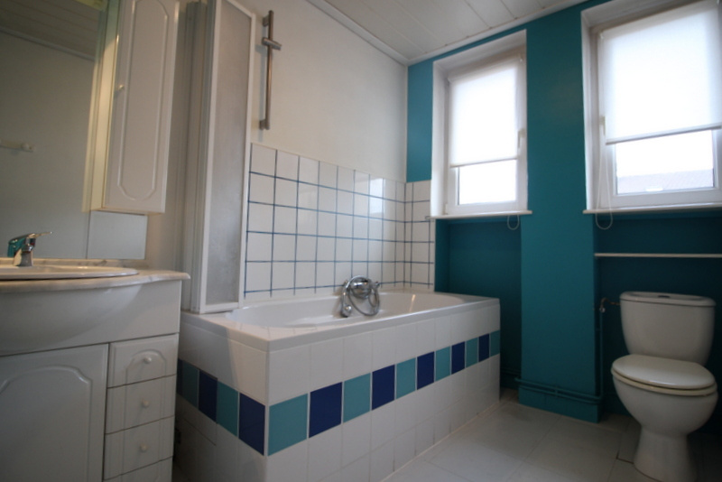 dalles au sol, 1 baignoire, 1 vasque, 1 WC, 2 radiateurs, 2 fenêtres, 1 VMC