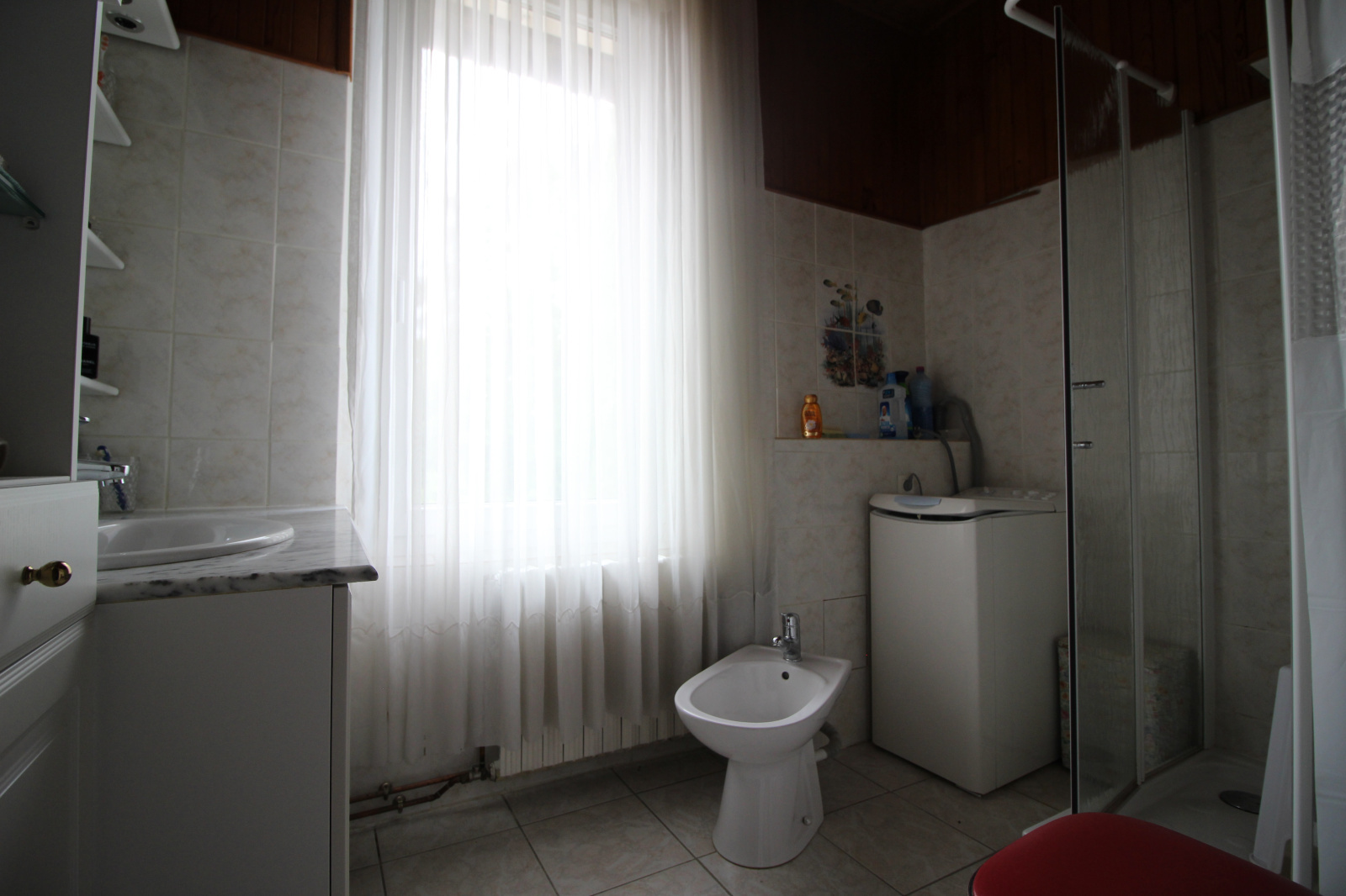 carrelage, 1 vasque, 1 douche, 1 bidet, 1 radiateur, 1 fenêtre