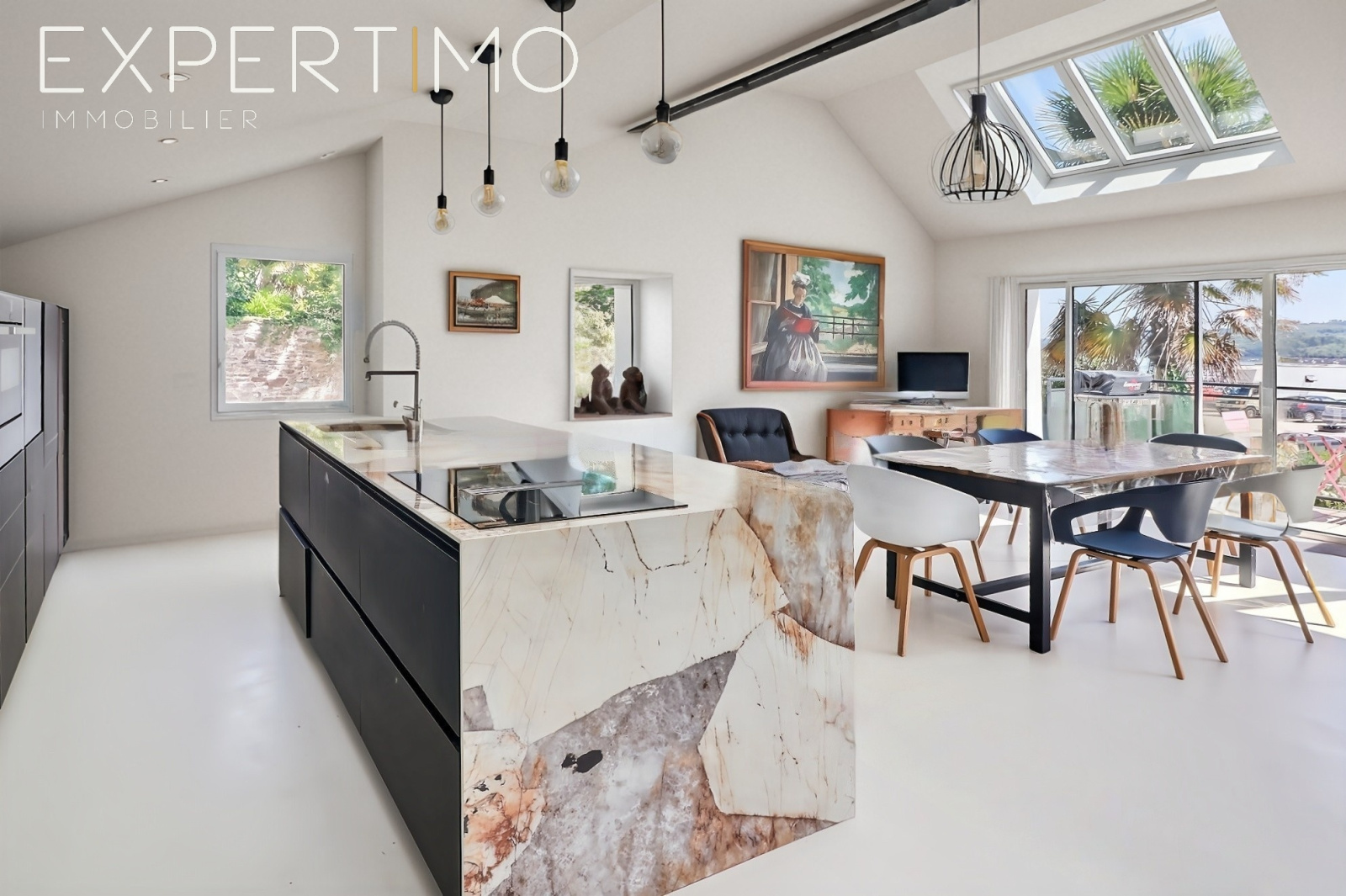 À l’étage, les pièces de vie ont été pensées comme un belvédère. La réception, ample et baignée de lumière, s’ouvre par de larges baies vitrées sur un balcon filant, suspendu face à l’eau. Le dedans et le dehors s’y confondent avec élégance. Le salon, structuré autour d’une cheminée contemporaine, invite à la contemplation, tandis que la cuisine, aux lignes épurées, prolonge cette esthétique avec discrétion et exigence.