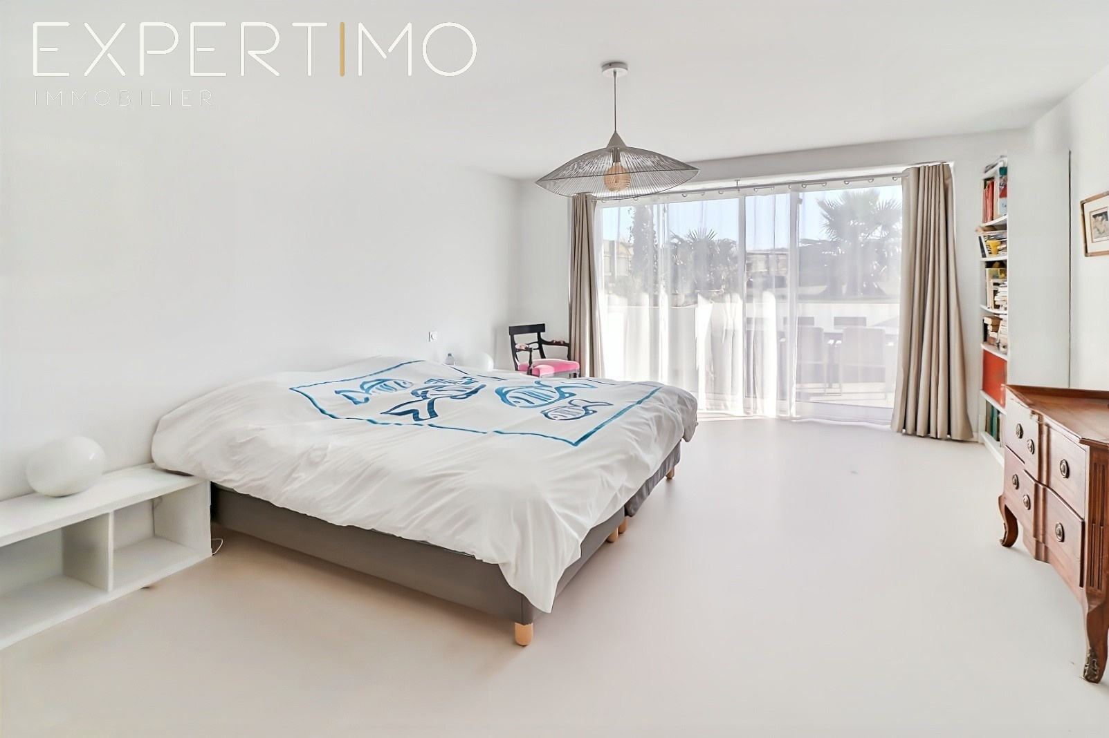 Le niveau inférieur accueille des espaces nuit à l’atmosphère apaisée, tournés vers le jardin et la mer. La suite principale, généreuse et ouverte sur la terrasse, évoque l’esprit d’une suite privée en bord de mer, avec dressing et salle d’eau aux finitions soignées. Une seconde suite indépendante offre le même confort, dans une harmonie parfaite.