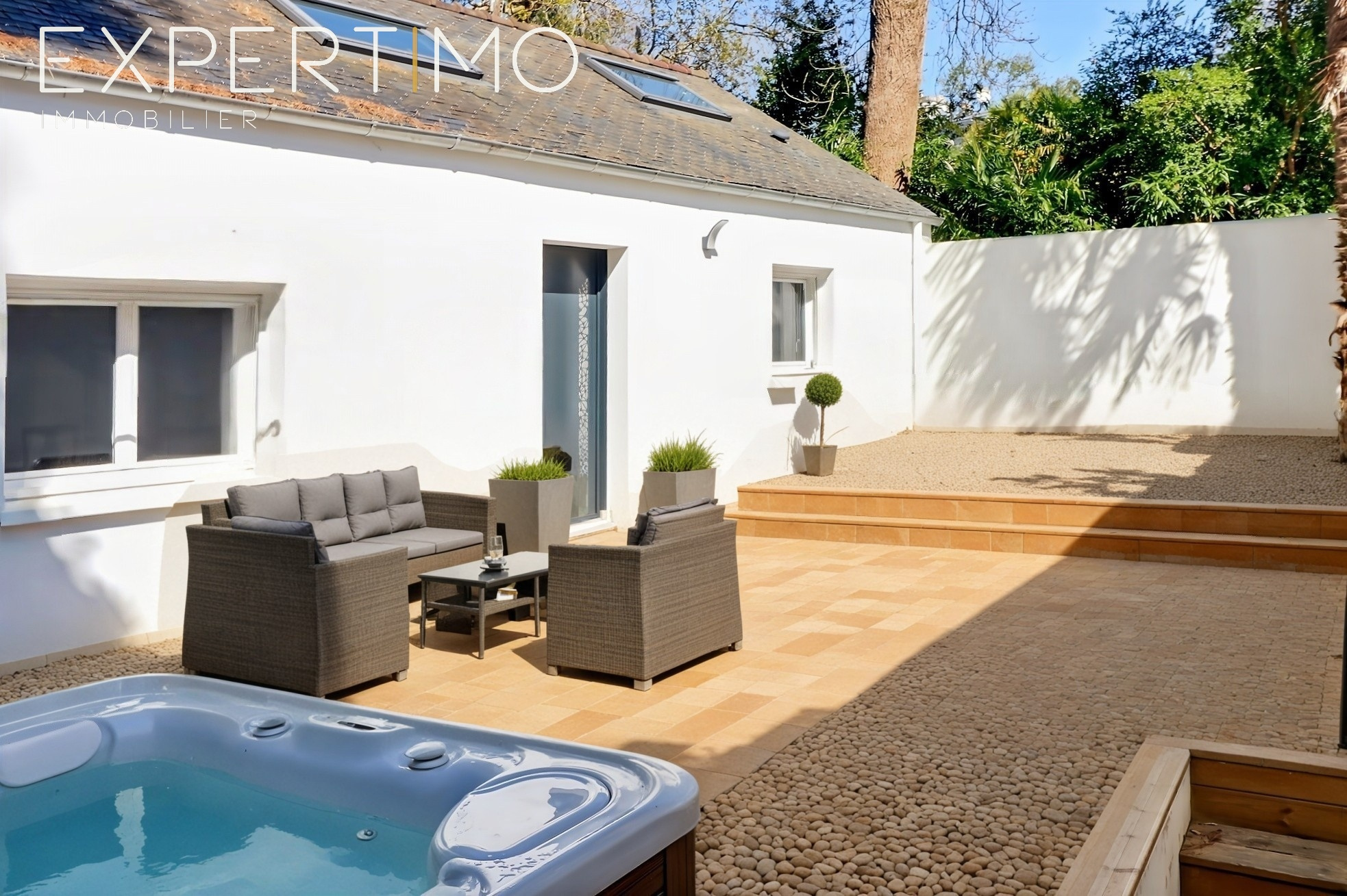 À l’abri des regards, les extérieurs composent un univers intime, presque secret. La terrasse bois devient un lieu de vie à part entière, ponctué d’un espace bien-être avec jacuzzi, où le temps semble suspendu. Le jardin, structuré avec soin, mêle nature et usage, entre potager, dépendances et espaces de détente.