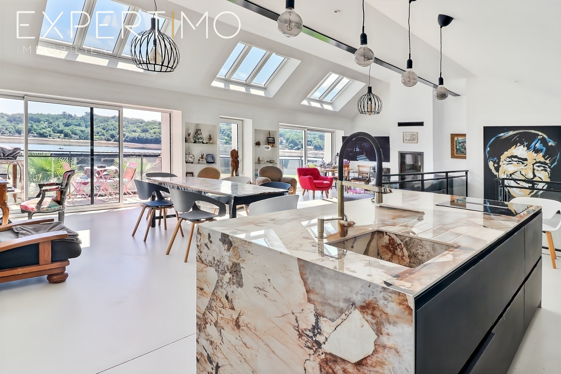 L’étage accueille les espaces de réception, volontairement positionnés en hauteur afin d’embrasser pleinement le panorama. La pièce de vie, aux proportions généreuses, s’ouvre largement par de vastes baies vitrées sur un balcon filant. La lumière y est omniprésente, et la vue, spectaculaire, se déploie sans obstacle du pont de Plougastel jusqu’au passage de la Cale. Une cheminée contemporaine vient structurer l’espace salon, tandis que la cuisine, élégamment intégrée, se distingue par son îlot central et ses équipements haut de gamme.