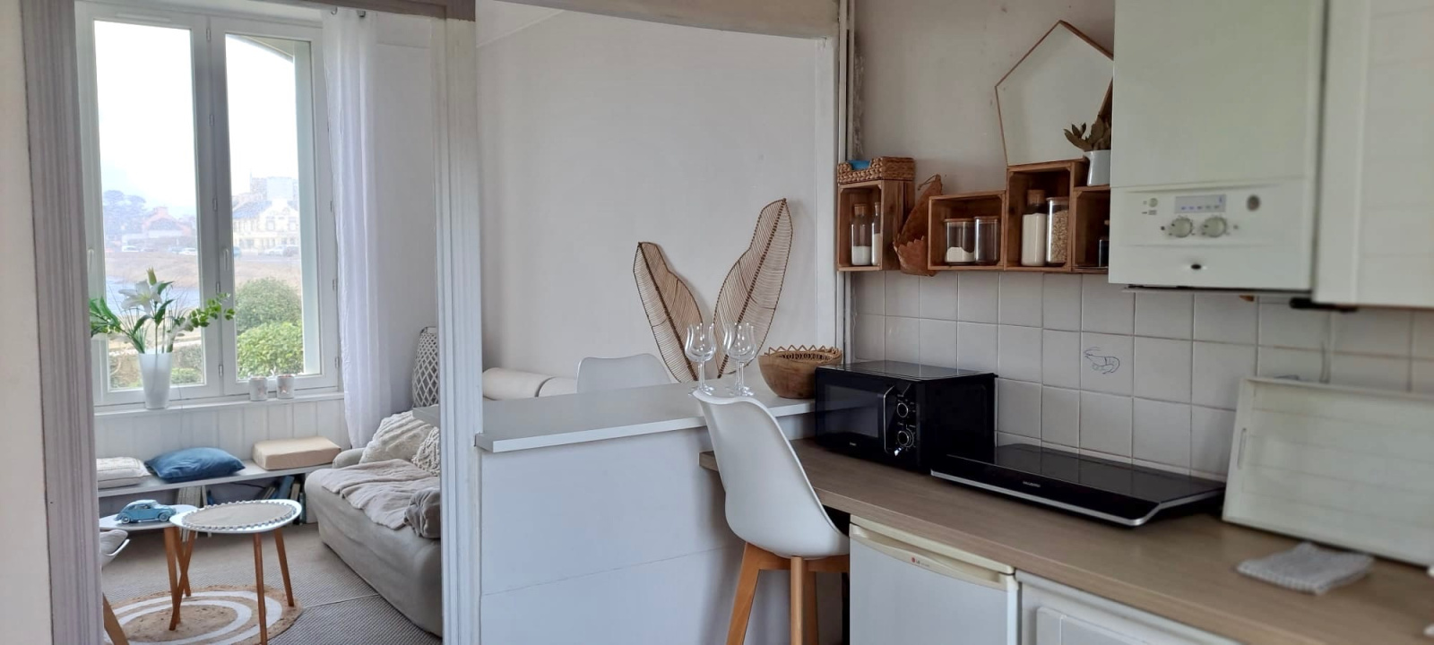 Sur un grand terrain constructible de 1321 m2, deux maisons, dont la maison principale est une maison de charme des années 30, face à la mer, au pied de la plage, avec vue sur le joli port d'Argenton (commune de Landunvez), en Finistère à la pointe de Bretagne. Cette maison sur 2 niveaux vous offre en rez-de-jardin : une entrée desservant la cuisine ouverte sur le séjour et le salon avec vue mer, une chambre et des toilettes. À l'étage, 2 chambres avec vue mer et un espace détente ou bureau avec possibilité d'une chambre supplémentaire, une salle d'eau avec WC. fenêtres PVC double vitrage,Chauffage au gaz, assainissement collectif. Jardin des deux côtés.