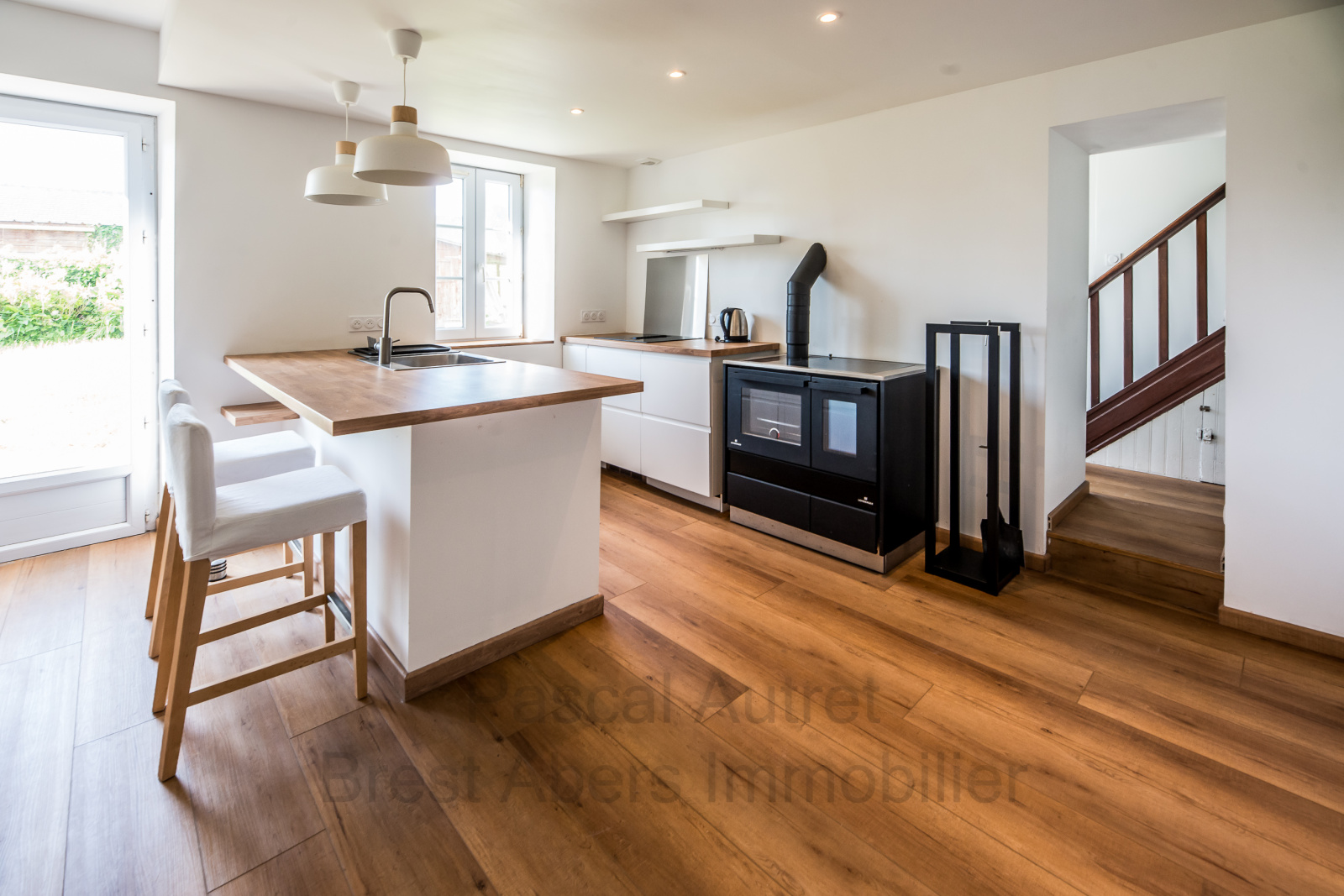 Un vaste salon-séjour lumineux avec poêle à bois, idéal pour vos soirées conviviales.