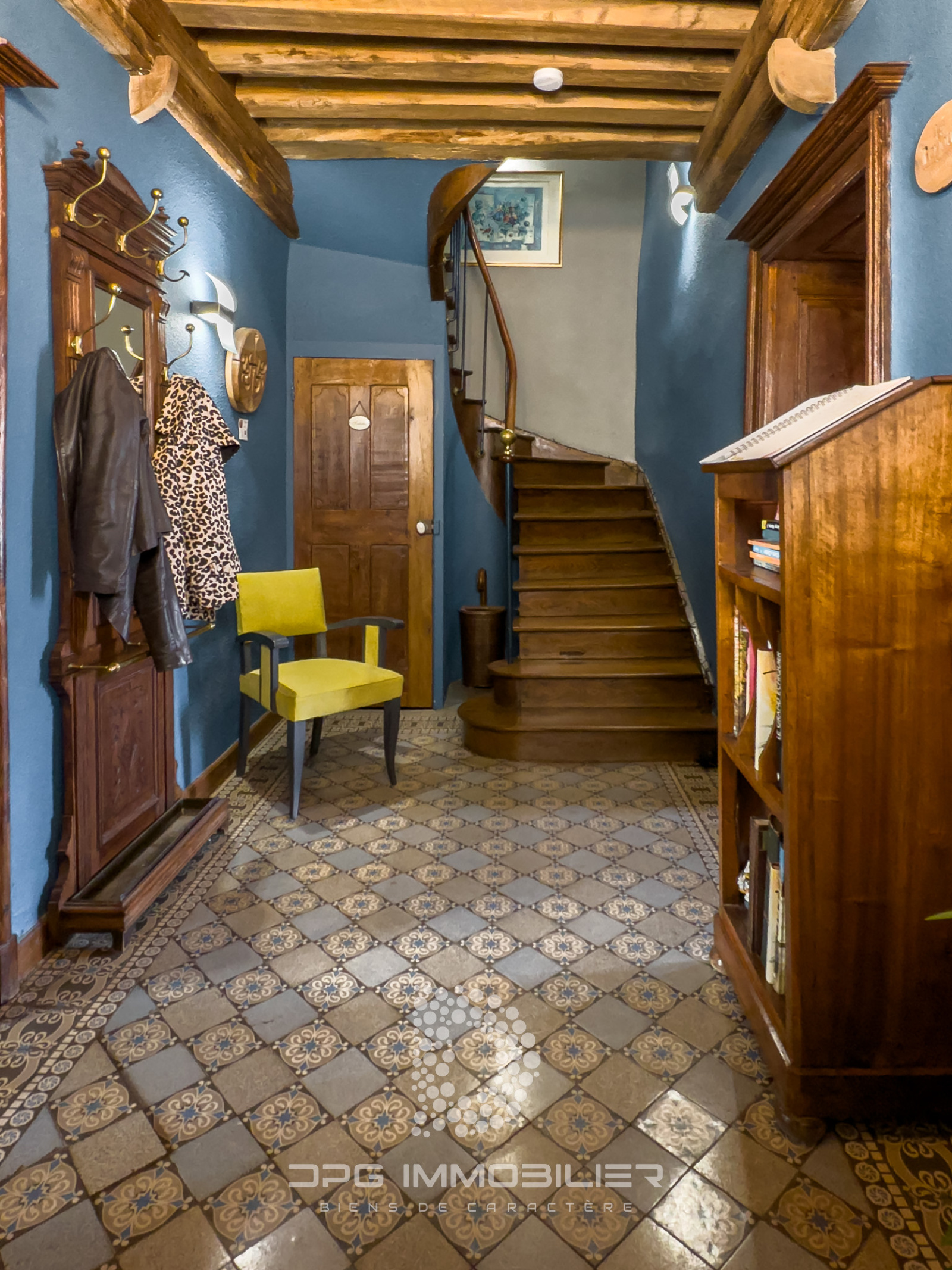 L’entrée donne immédiatement le ton : un hall accueillant habillé de carreaux de ciment et de boiseries anciennes mène aux pièces principales.