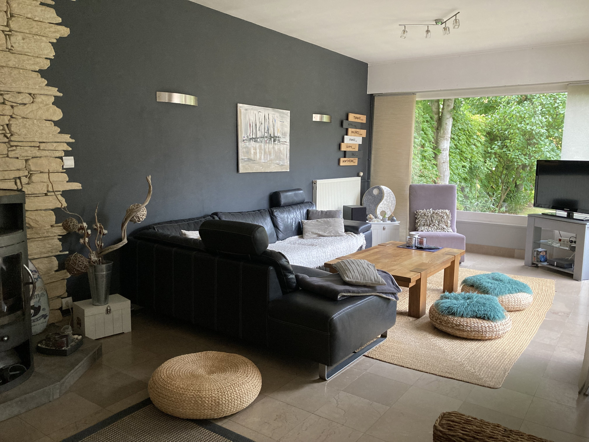 - Au rez-de-chaussée : une entrée, vestaire et wc, une vaste pièce de vie d'envion 65 m2 offrant un espace cuisine équipée ouverte sur le coin repas, un espace salon avec poêle à bois et une jolie vue sur la terrasse en bois et le jardin orientés plein sud, un cellier-laverie,