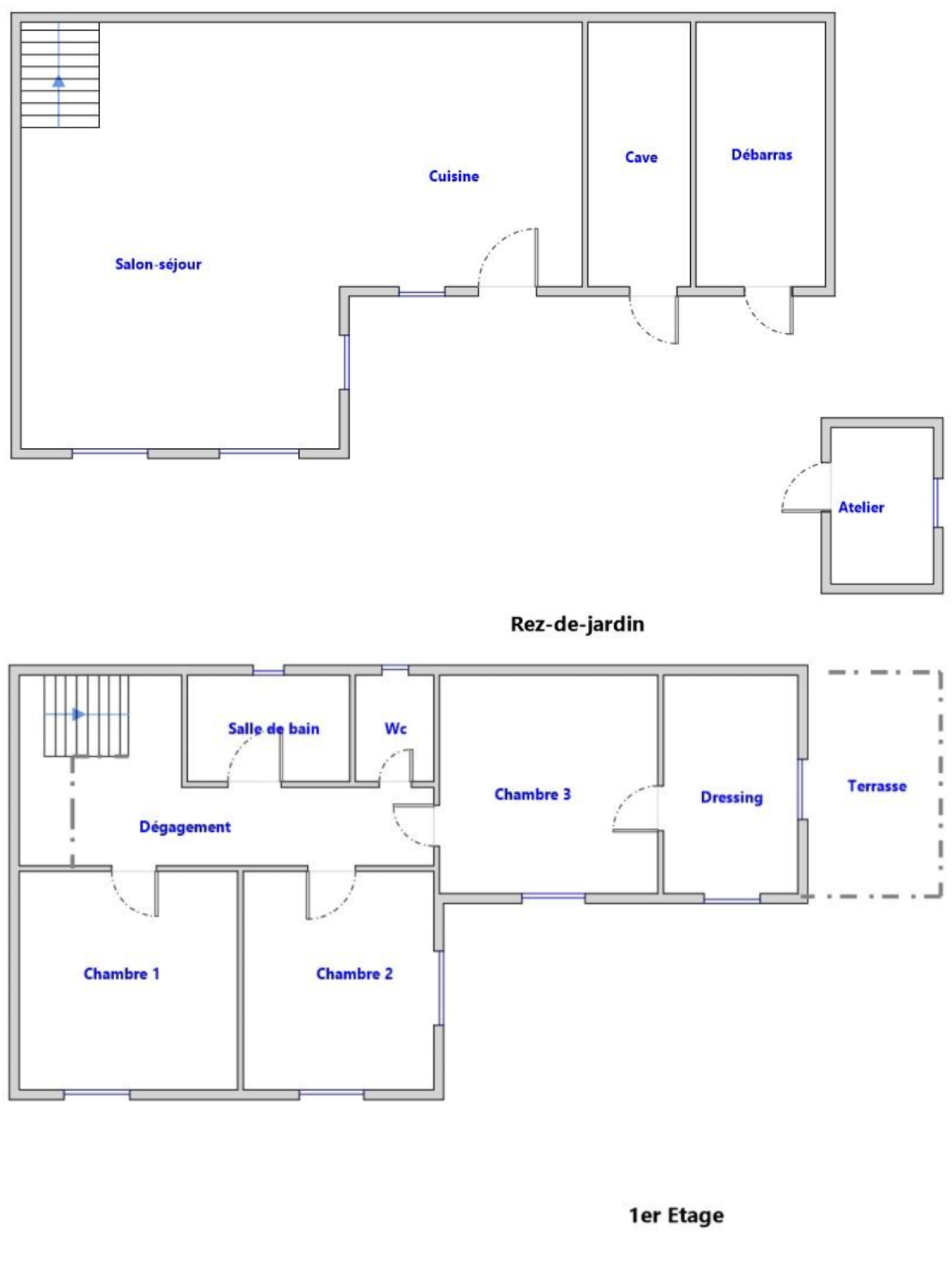 À l’étage, le coin nuit se compose de trois chambres de 9,80 m², 10,30 m² et 11,90 m², cette dernière bénéficie d’un accès direct à un dressing spacieux de 8,20 m², lui-même ouvrant sur une terrasse, avec vue dégagée sur la propriété et la nature environnante. Une salle de bain ainsi qu’un WC complètent cet étage.