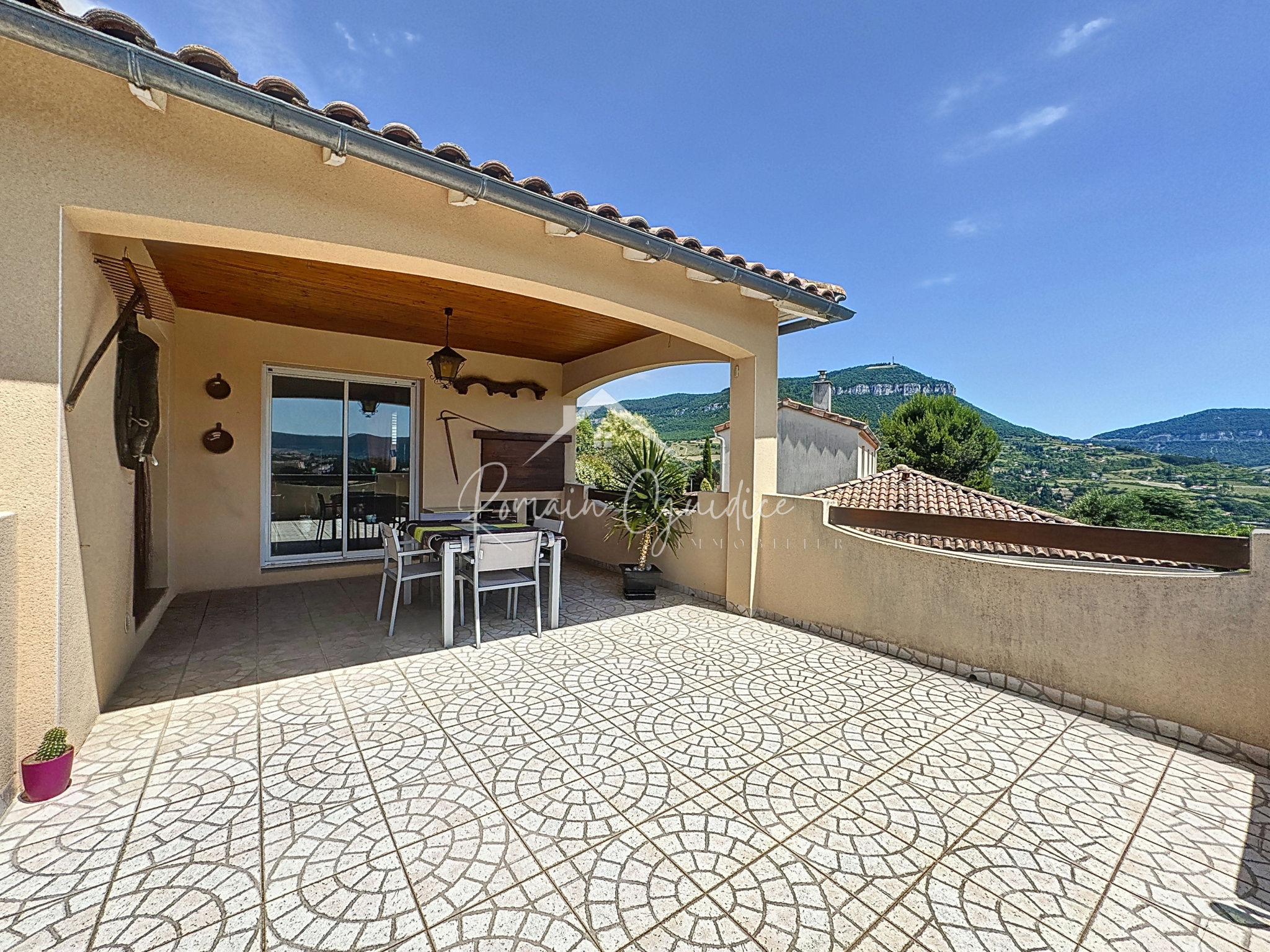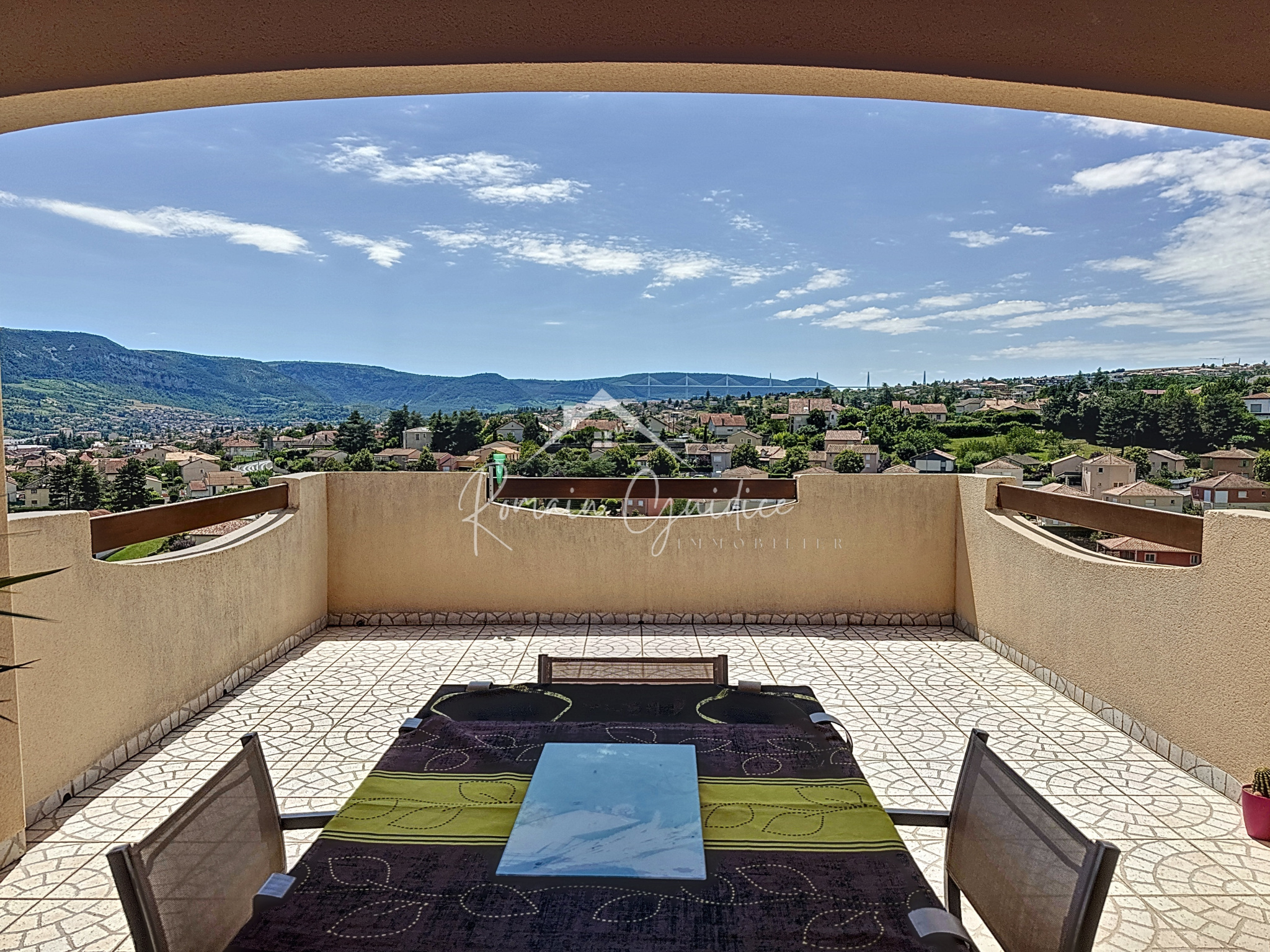 En plain-pied la maison est composée d'une pièce à vivre / cuisine ouverte de près de 60 m² donnant sur une terrasse de près de 30 m² avec vue imprenable sur la ville de Millau et son Viaduc.
