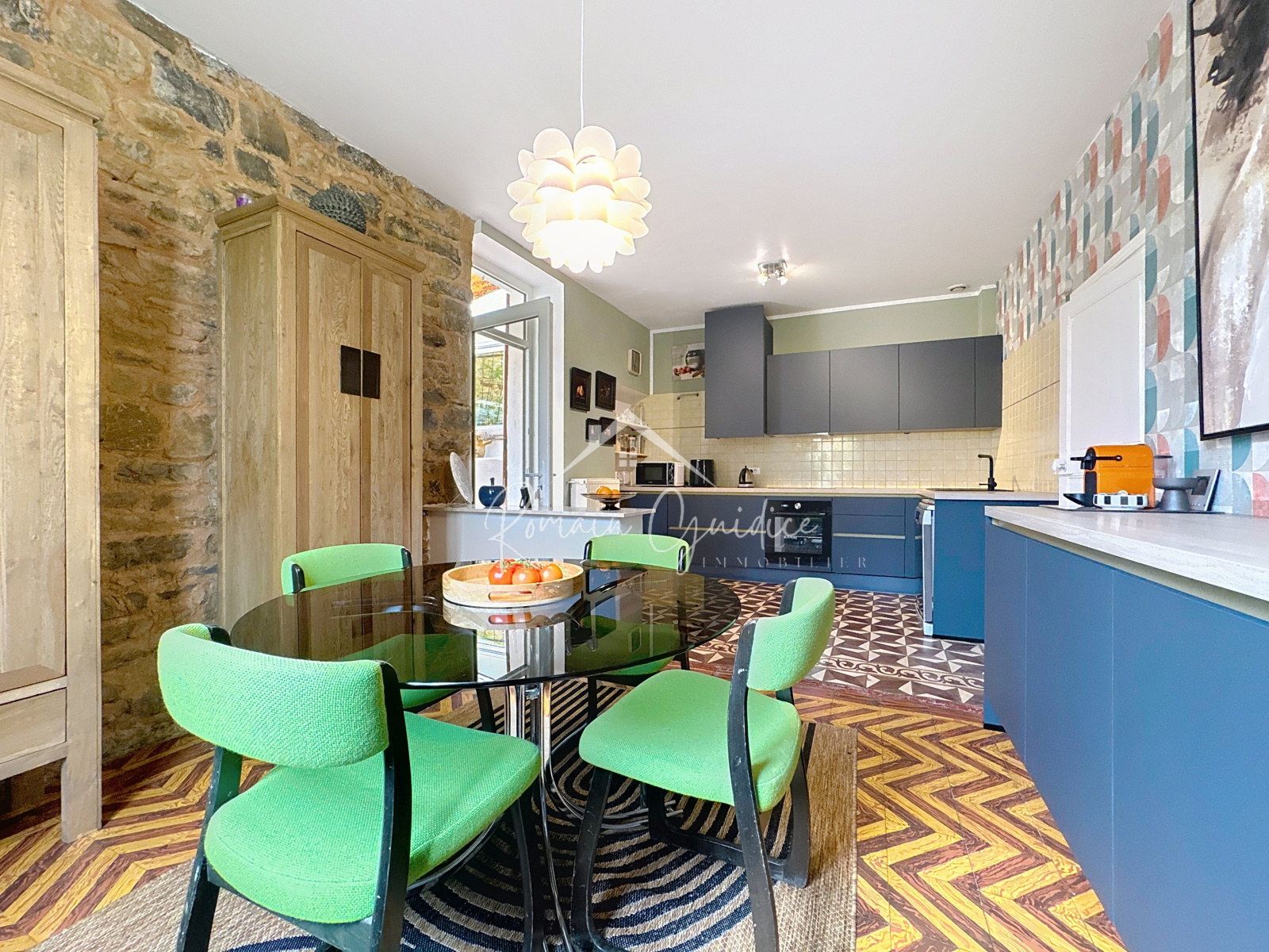 • D’un côté, une cuisine toute neuve, intégrée et équipée, ouverte sur une salle à manger, le tout agrémenté d’un superbe mur en pierre apparente. L’ensemble, d’une surface de 21 m², se prolonge sur une spacieuse véranda de 19,40 m², idéale pour vos repas en toute saison, avec un coin pratique aménagé en buanderie.