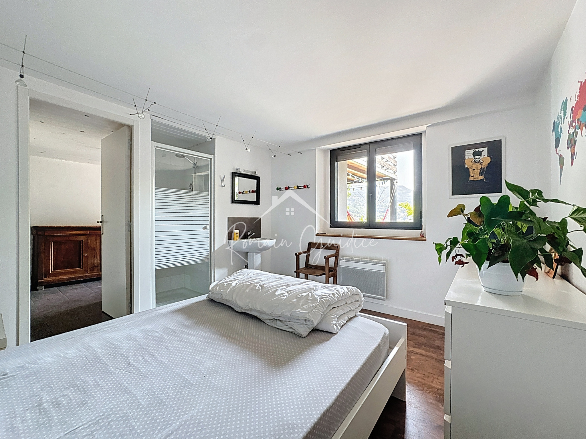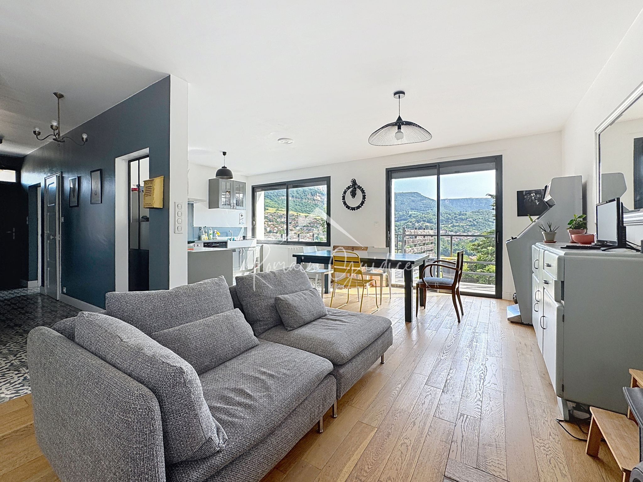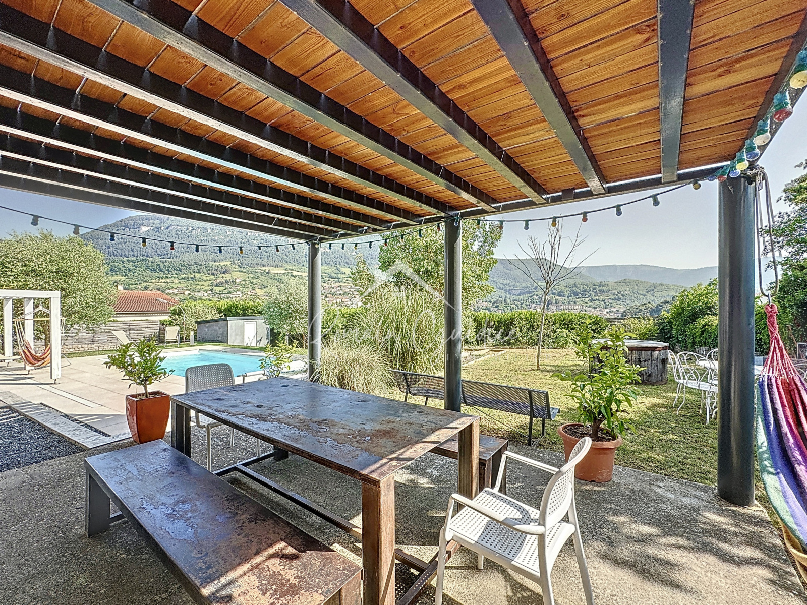 Dès l’entrée, vous serez séduits par la pièce de vie lumineuse de 33,70 m², avec sa cuisine ouverte et son accès direct à une terrasse plein sud, surplombant les paysages dégagés des collines environnantes. Un escalier extérieur mène au jardin et à l’espace piscine.