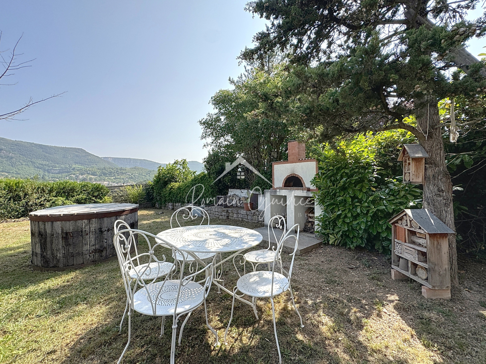 Le terrain de 870 m², plat et bien entretenu, contenant olivier, figuier et cerisier est un véritable havre de paix. Il accueille plusieurs espaces extérieurs :