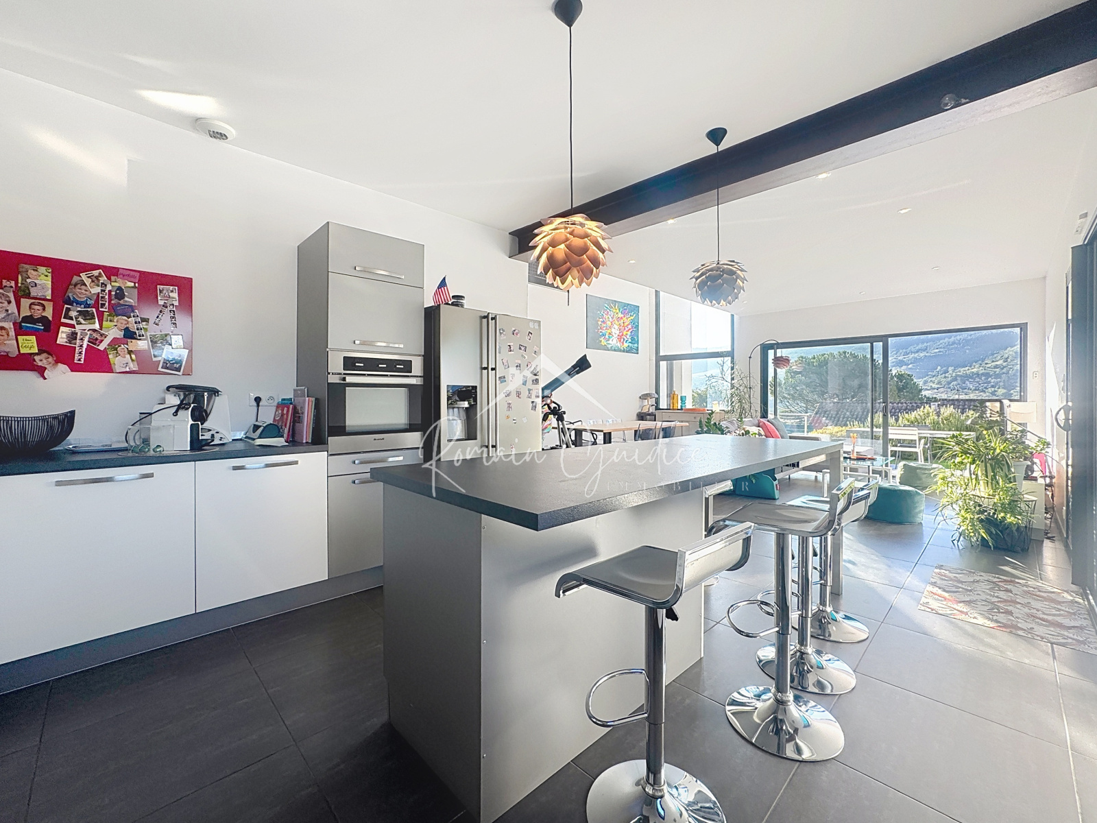 La pièce de vie de 49,51 m², baignée de lumière, séduit par son volume et sa convivialité, avec un accès direct à l’espace piscine carrelé.