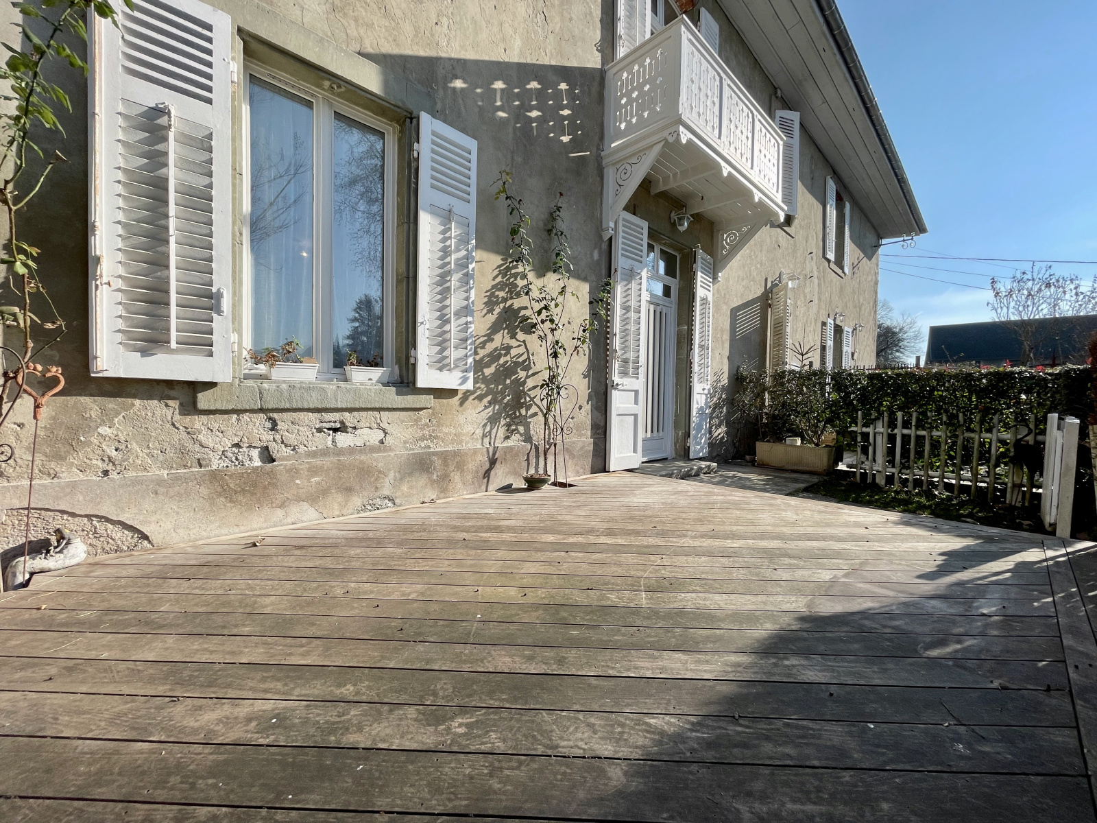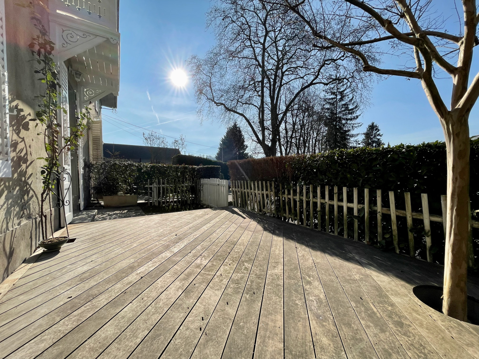 —> Extérieur : magnifique terrasse bois, arborée, devant la maison - vue sur le Granier