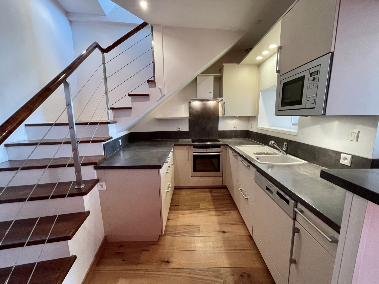 Cuisine entièrement aménagée et équipée : lave vaisselle NEFF, four pyrolyse NEFF, four micro-ondes NEFF, plaque vitro-céramique 4 feux NEFF, réfrigérateur LIEBHERR