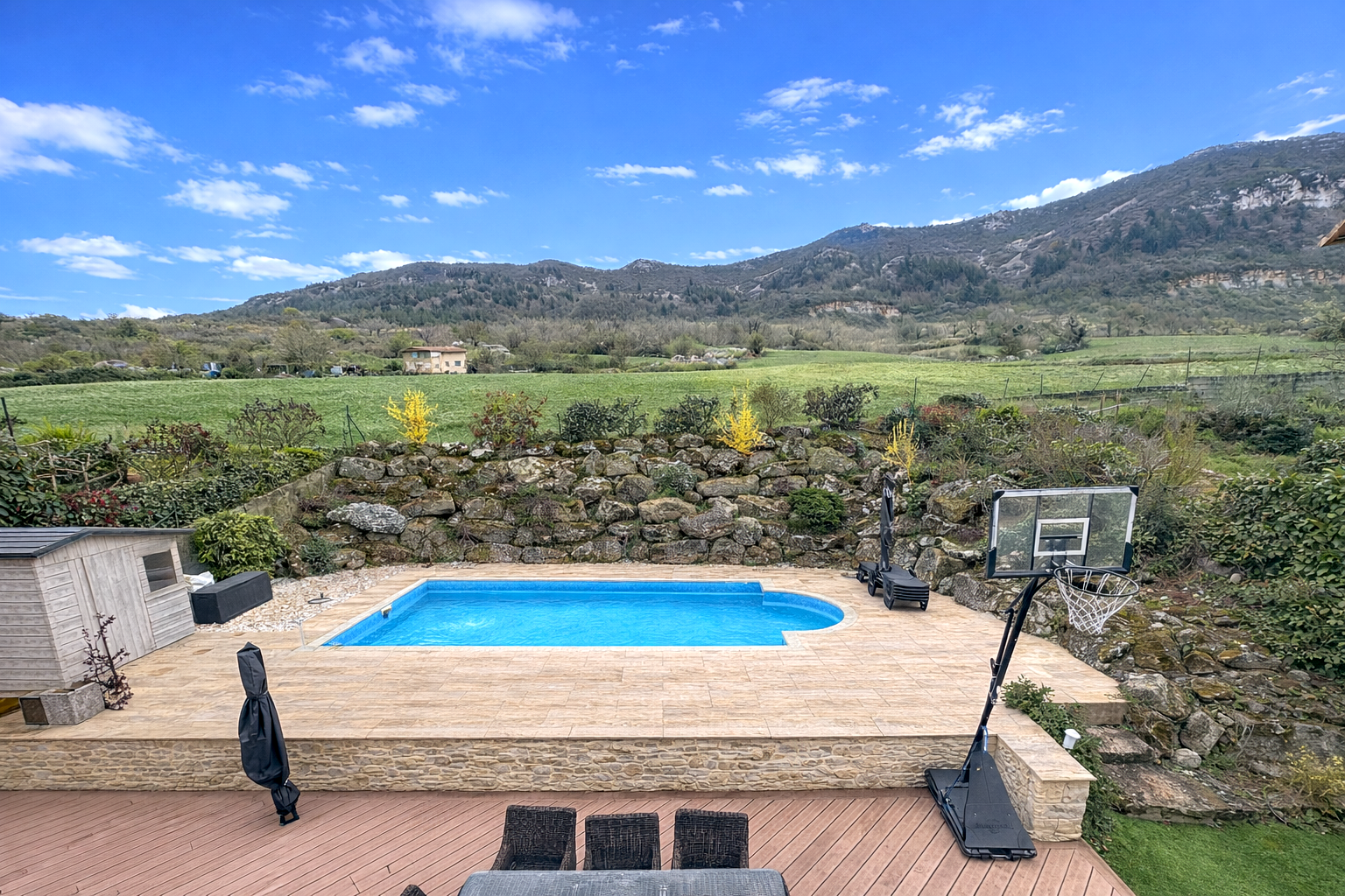 La piscine de 8 x 3,5 m, avec traitement au sel, pompe à chaleur et nage à contre-courant, s’intègre parfaitement dans un espace aménagé avec terrasse en composite, nécessitant peu d’entretien.