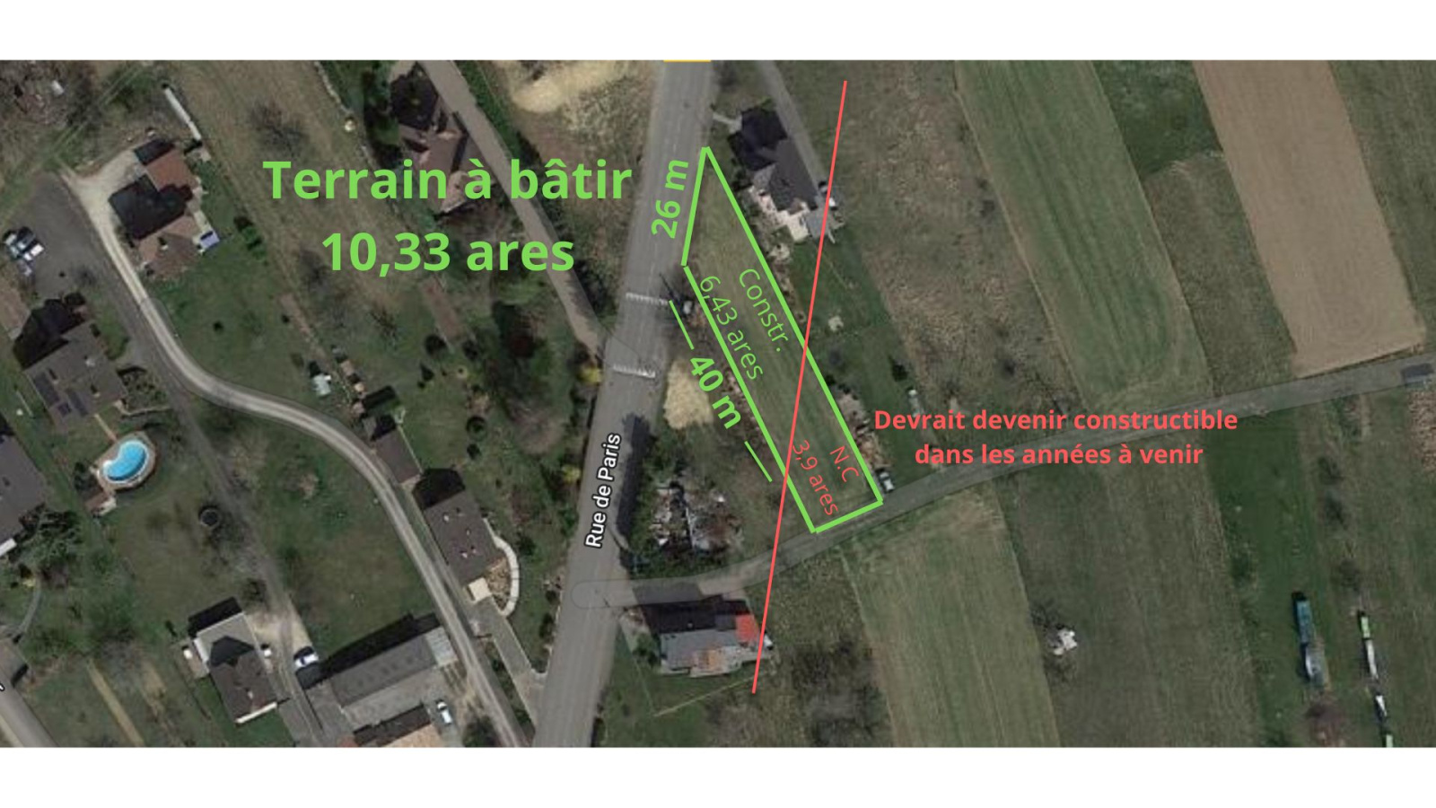 Terrain à bâtir de 10,33 ares avec vue sur les champs. Libre de constructeur.